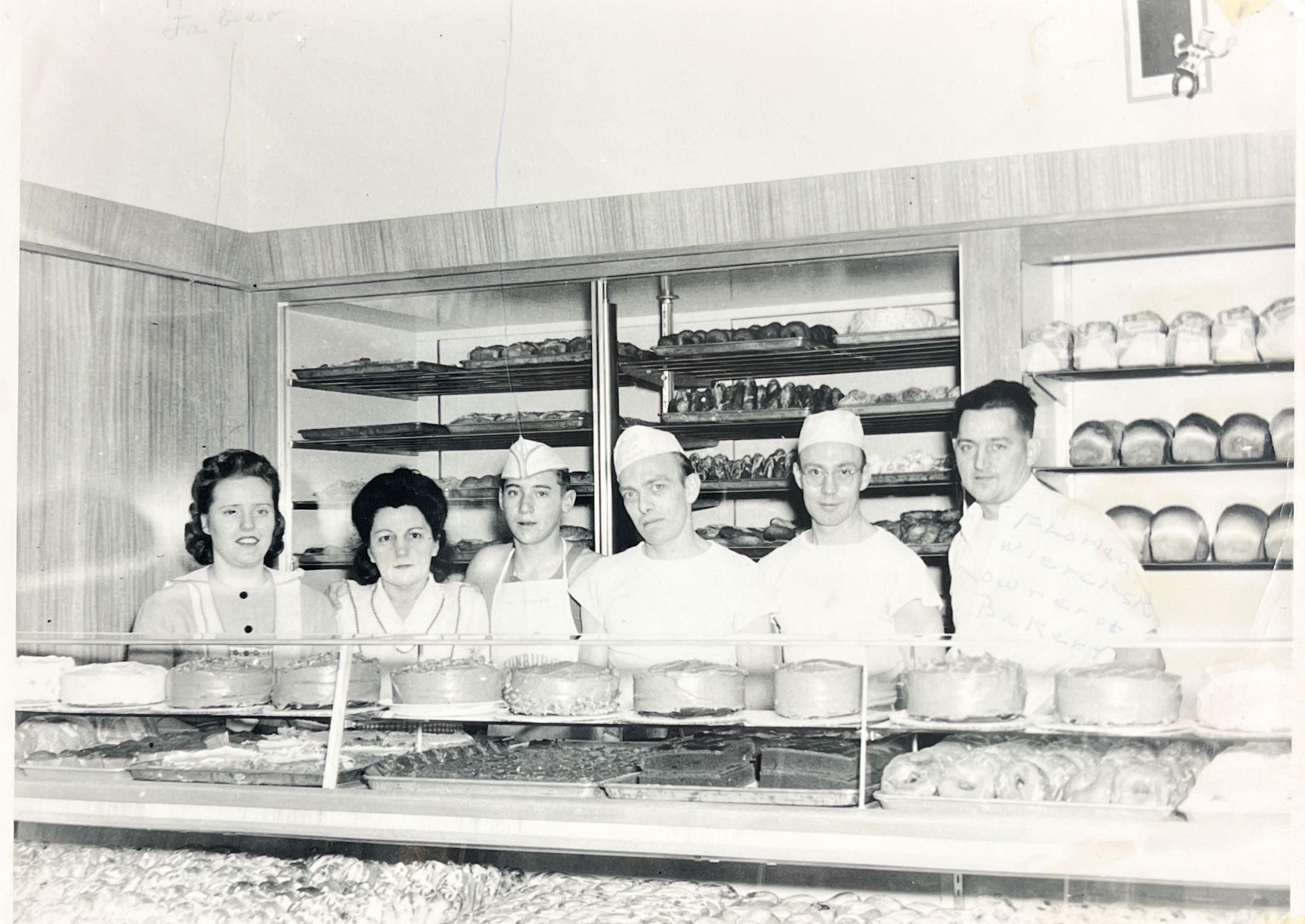 Photograph of employees, Ripon Bakery. In the photograph are, Betty Jaber, Diamond, Don Krueger, Jerome Taube, Florian Wiescinski. c. 1950s