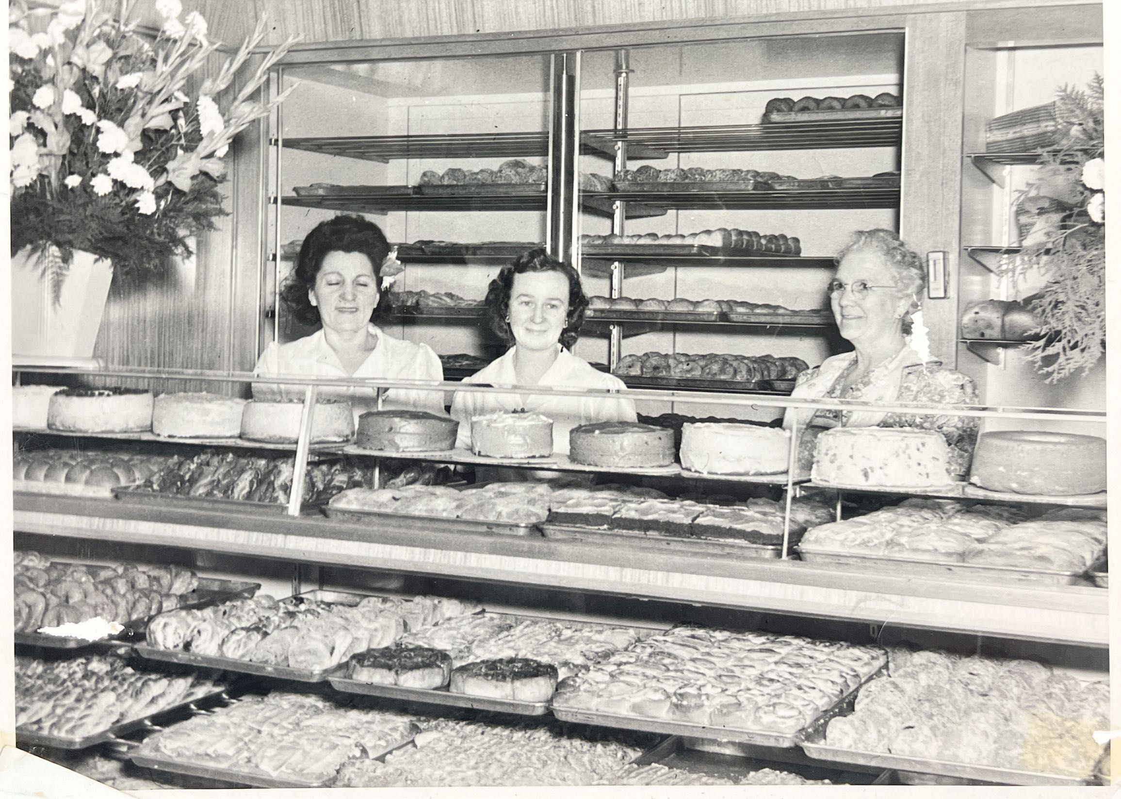 Photograph of employees, Ripon Bakery. In the photograph are Hildegard Sommerfeldt, Diamond Lil, Marie Blake. c. 1950s