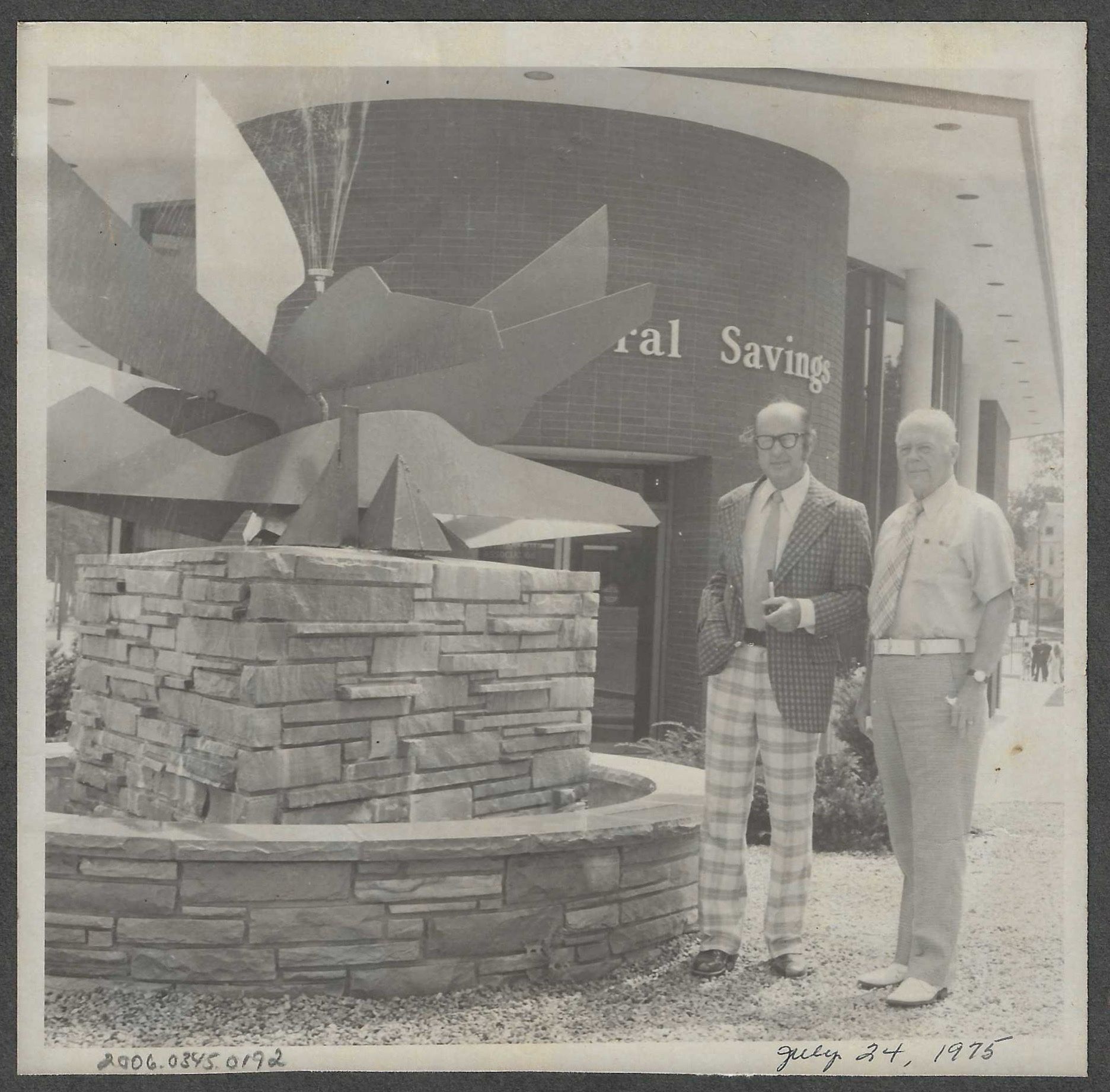 Black & white 6 x 6 photograph of Ripon Federal Savings with sculpture in front. July 24, 1975 written at bottom right margin of photo. Two men in photograph need identification. Wardrobe typical of business attire during that era. Building located at triangle of Watson, Scott, and Fond du Lac streets.Acquisition