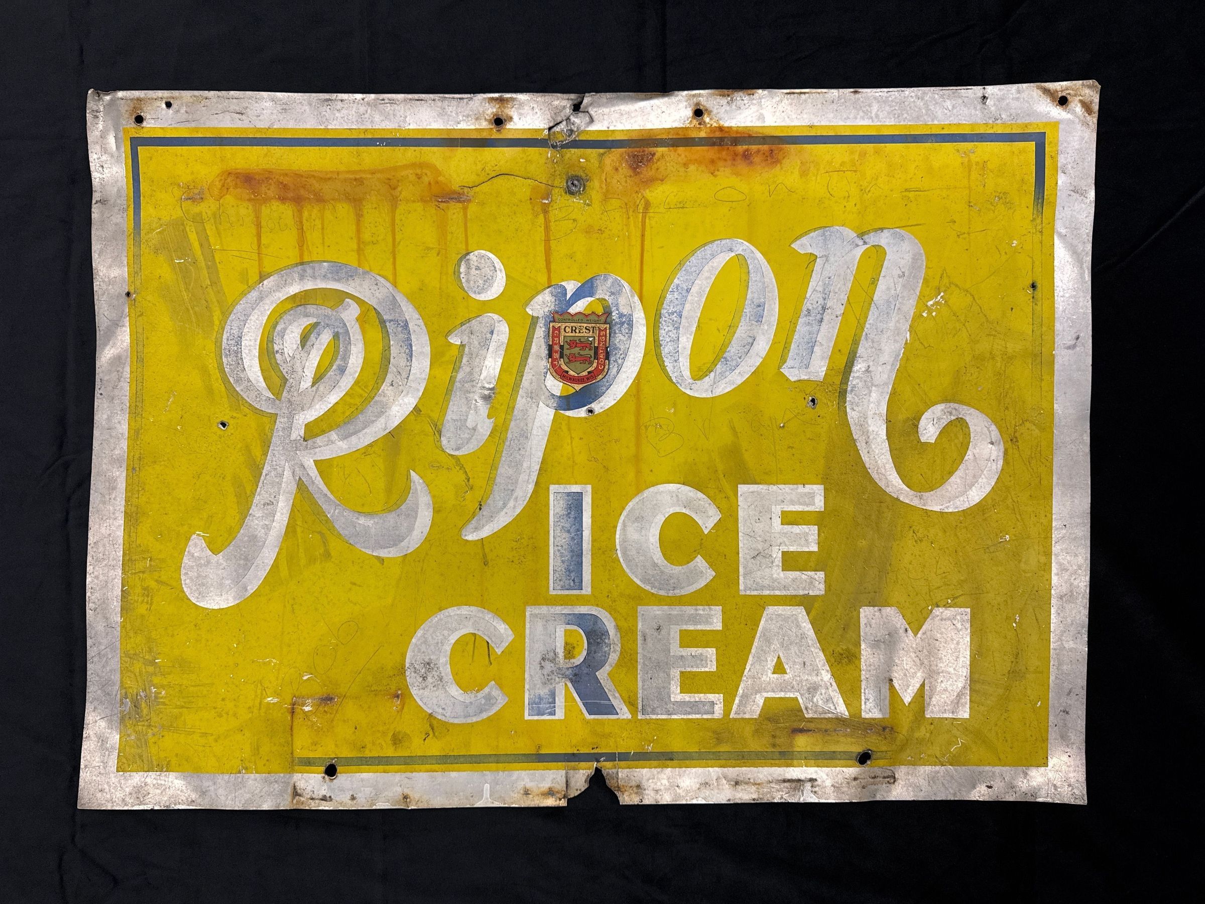 Ripon Ice Cream 28 x 21 tin sign. Yellow with grey stencilled letters. 6 holes - 3 on top and 3 on bottom. Donor worked for the City Public Works Department and cleaned out Milt's Liquor. Found sign that Milt Werdin had used the back as For Sale sign. Donor found sign in building behind Milt's in storage room. Milt's was located at 119 Blossom and in business from 1947-1992. Building was razed. Ripon Ice Cream in business early 1920s-1966. Located east of 100 block Watson St.Collection