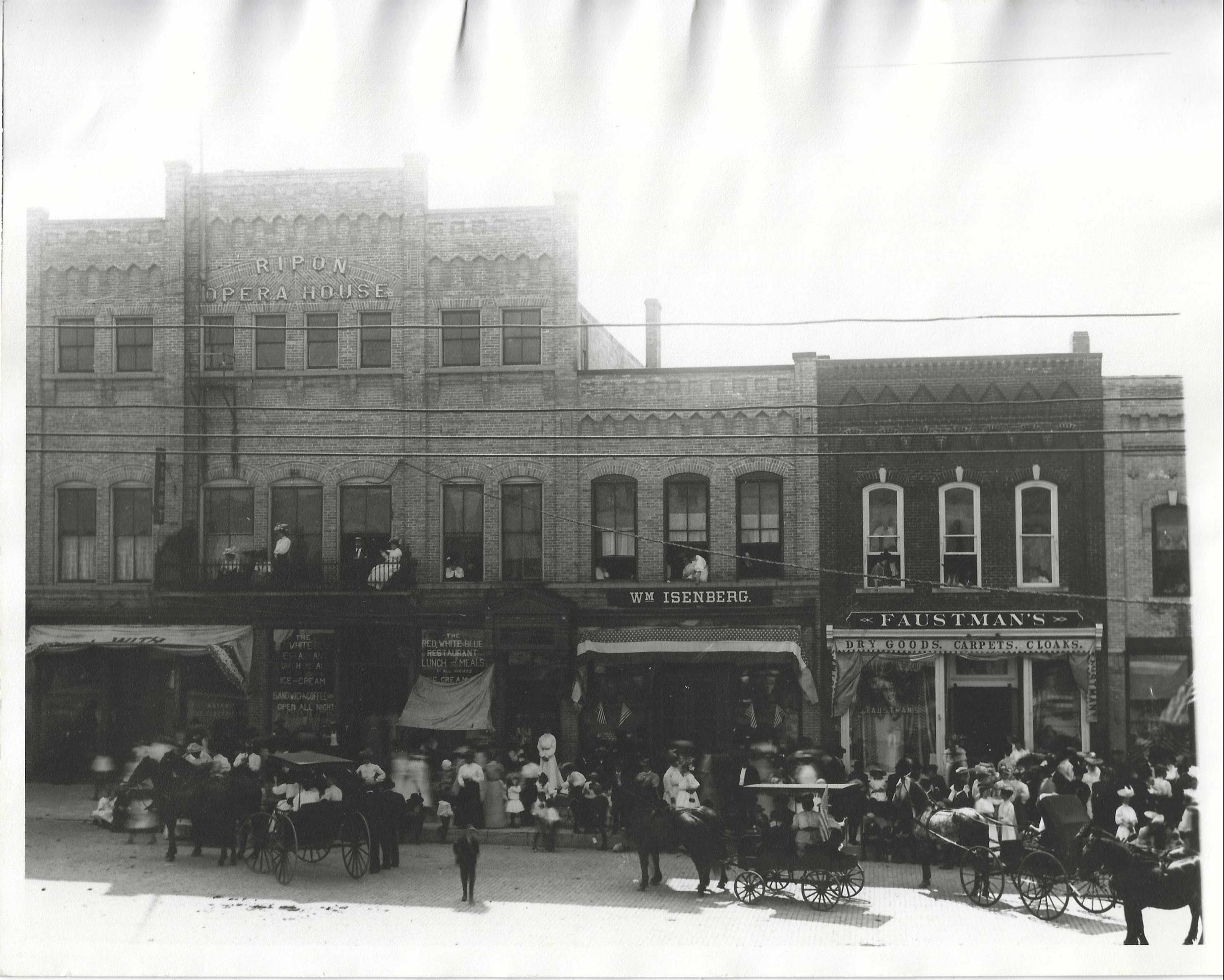 8x10 b&w photo of Ripon Opera House on west side of Public Square. Wm Isenberg and Faustman's are two storefronts visible. Similar to 2006.0345.0116 which is dated July 4, 1906. While similar this photo shows horses and buggies. Unclear whether for the parade or gathering for the festivities. Opera House and Isenberg building, known as the Nohl building, burned on September 30 1906.Acquisition
