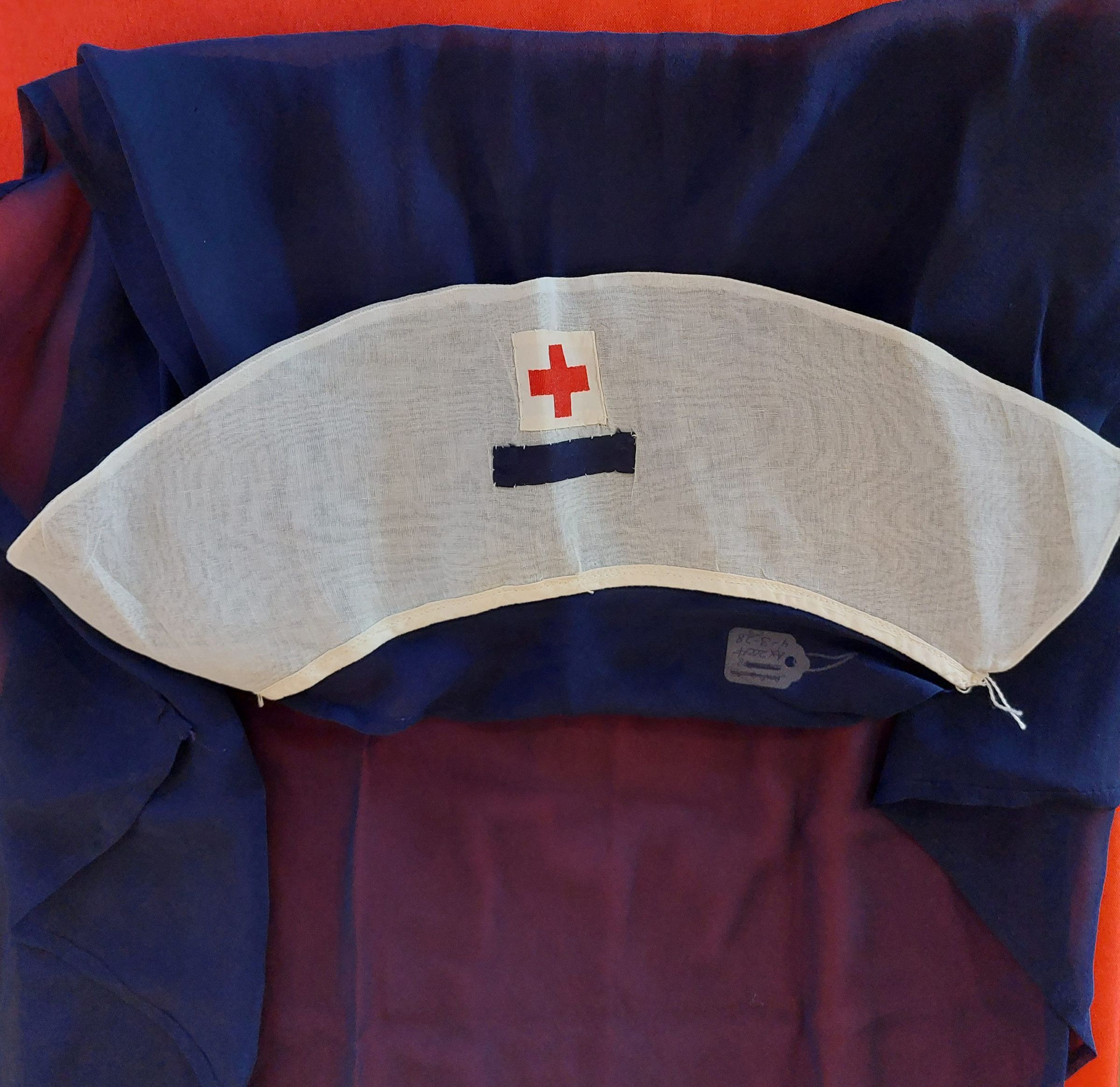 Scarf has white visor with sewn-on red cross and navy bar. Navy chiffon scarf which hangs down back of wearer is sewn onto white visor. Probably worn by Red Cross volunteer making medical dressings. Thought to have been worn by Adelaide Corliss in WWII but possibly from WWI.