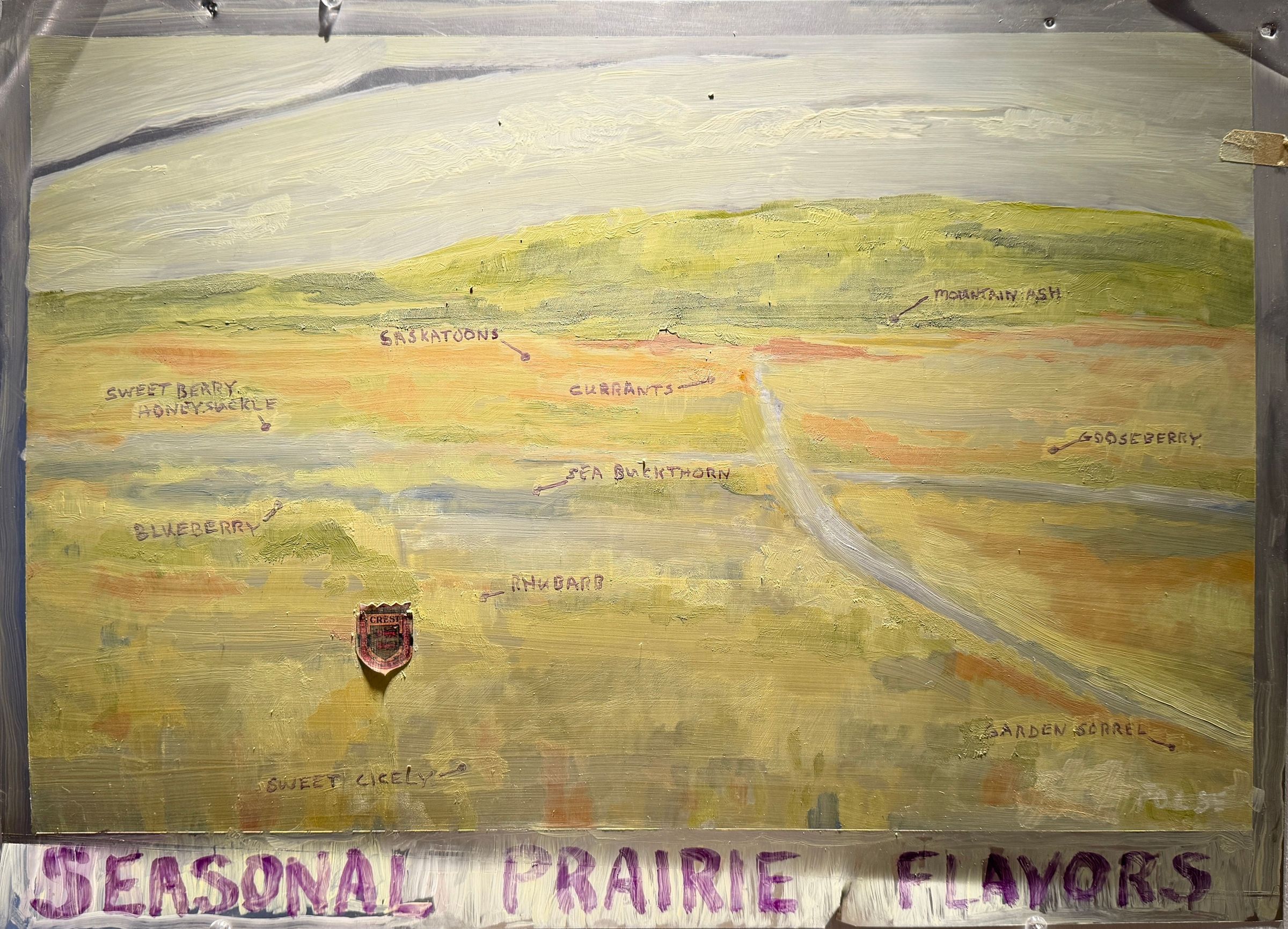 Artist Statement: For the Gimme a Sign! exhibition, artist Dick Folse responded to the Ripon Ice Cream sign in the Ripon Historical Society collection by producing an oil on aluminum painting suggestive of a companion sign which advertises seasonal prairie flavors from fruits, plants, and trees. The limited-palette painting of the Ceresco Prairie with call-out text of plant flavor locations is reflective of the over 90 paintings Folse has produced about the prairie in the past three years and is a whimsical addition to his oeuvre.Context