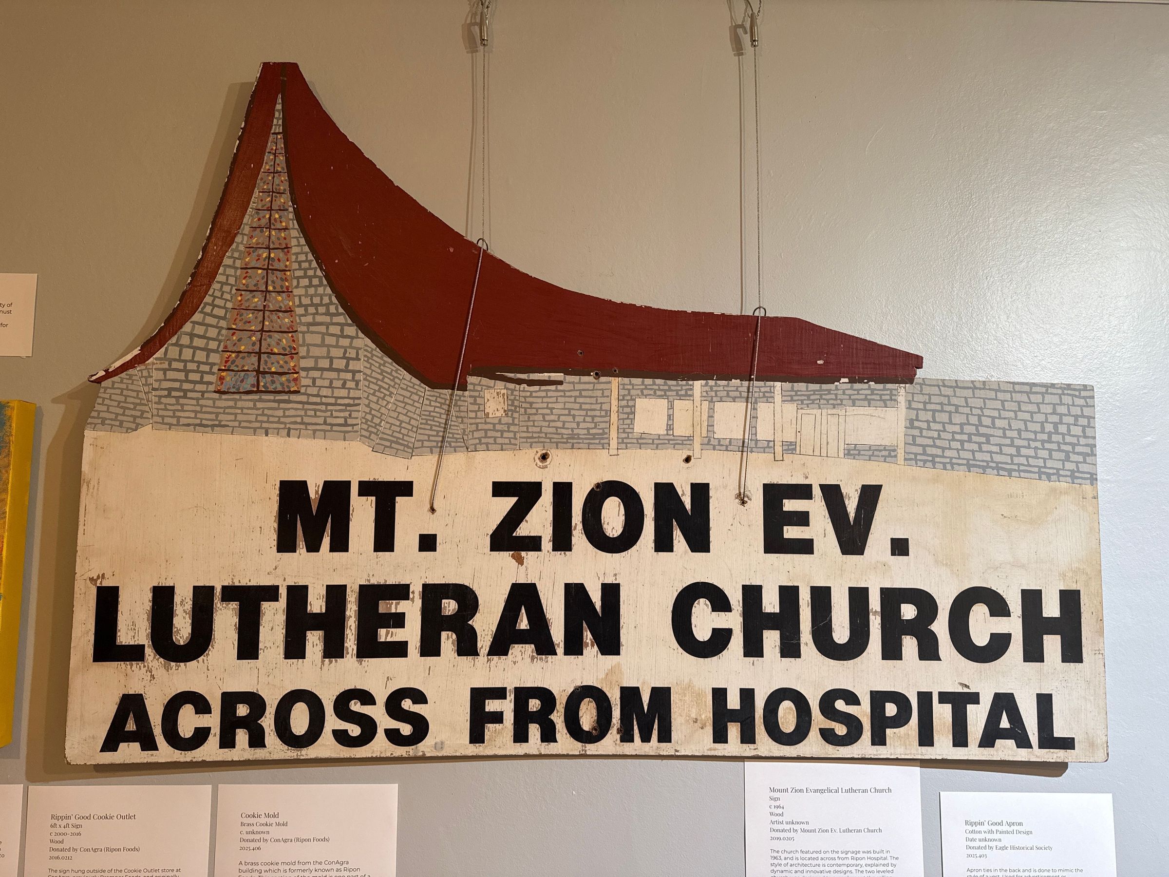 Wooden sign - Picture of Mt. Zion Evangelical Lutheran Church on the top. "Mt. Zion Evangelical Lutheran Church Across From Hospital". 18x48.5". 34.5" tall at peak of church. Date/age unknown. Church on sign was built in 1964.
