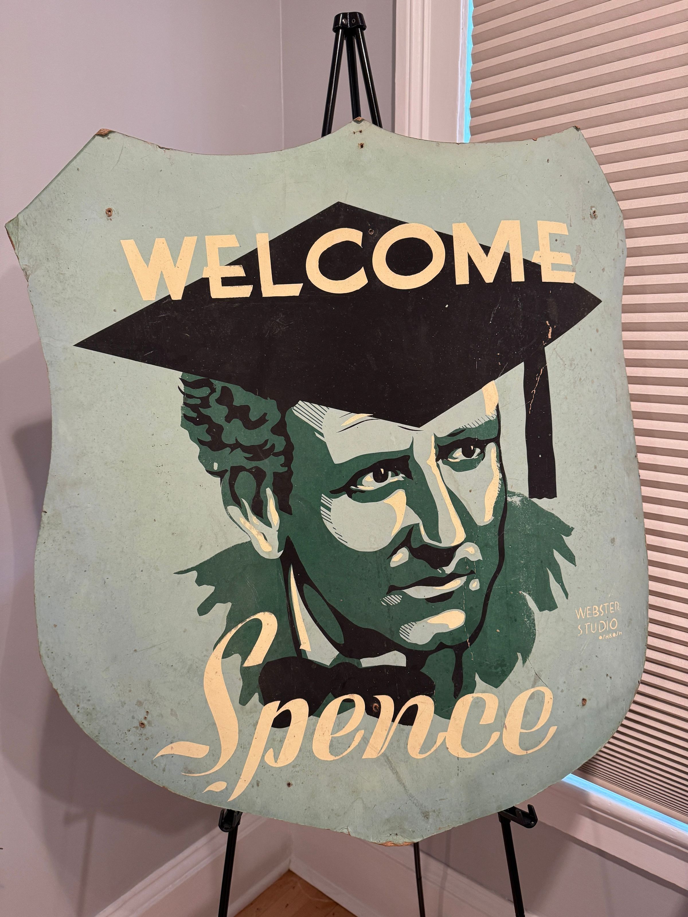 Sign created in 1940 to welcome Spencer Tracy to Ripon College for an honorary degree. Sign features a stenciled artist rendering of Tracy wearing a graduation cap. The sign reads, "Welcome Spence."