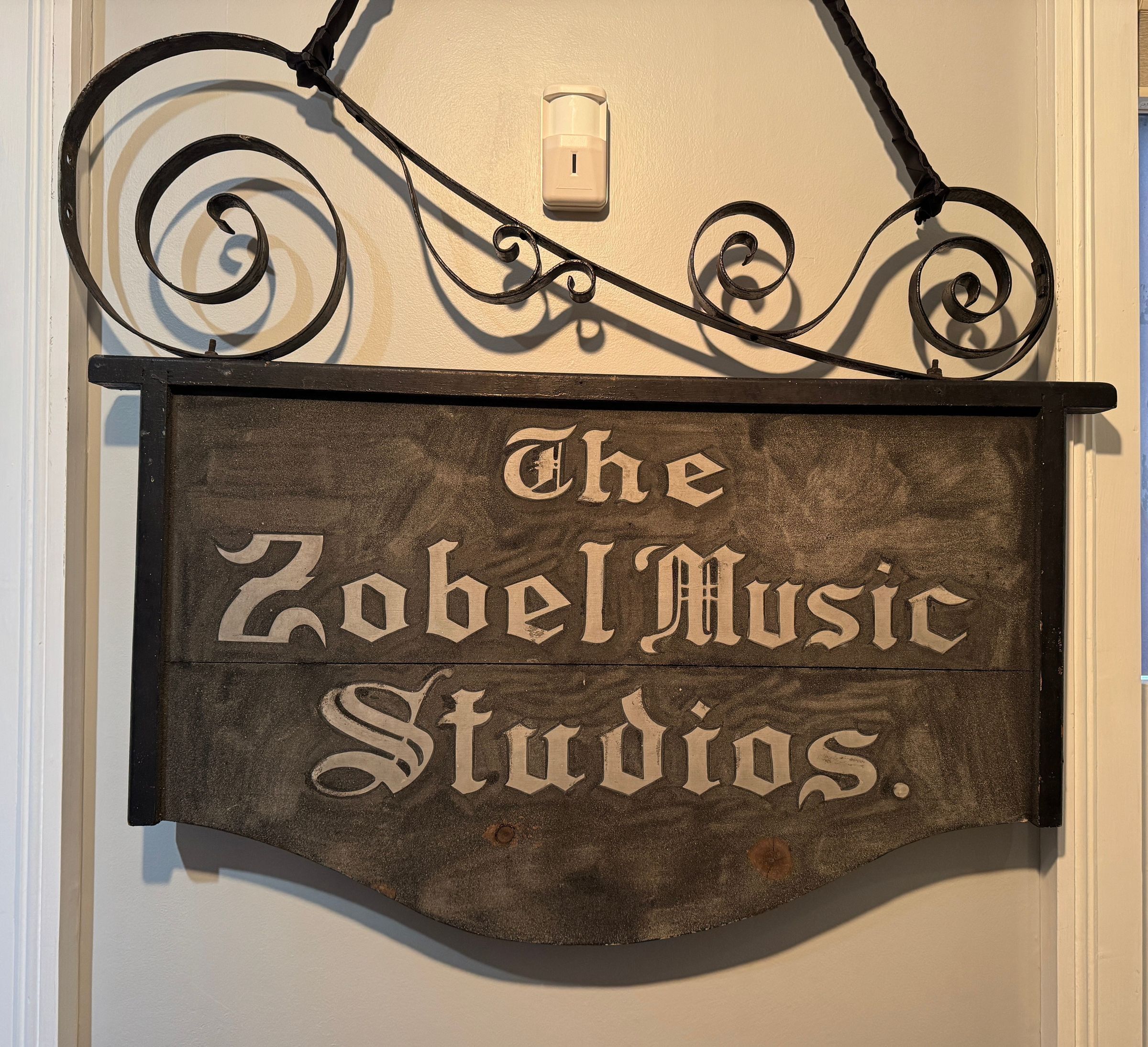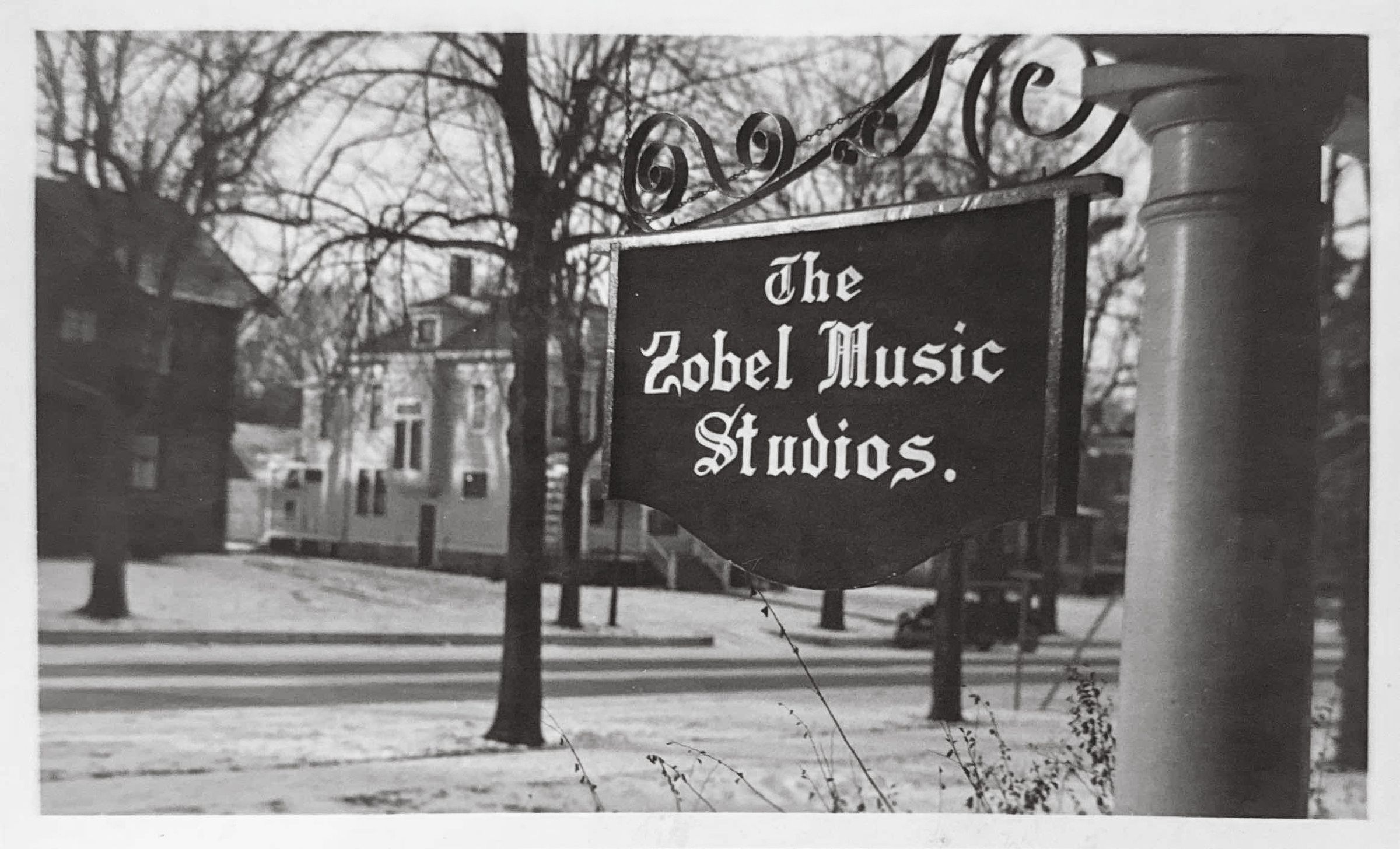 Sign for Zobel Music Studios. Sign hung outside the Zobel family home at 603 Watson St.Context