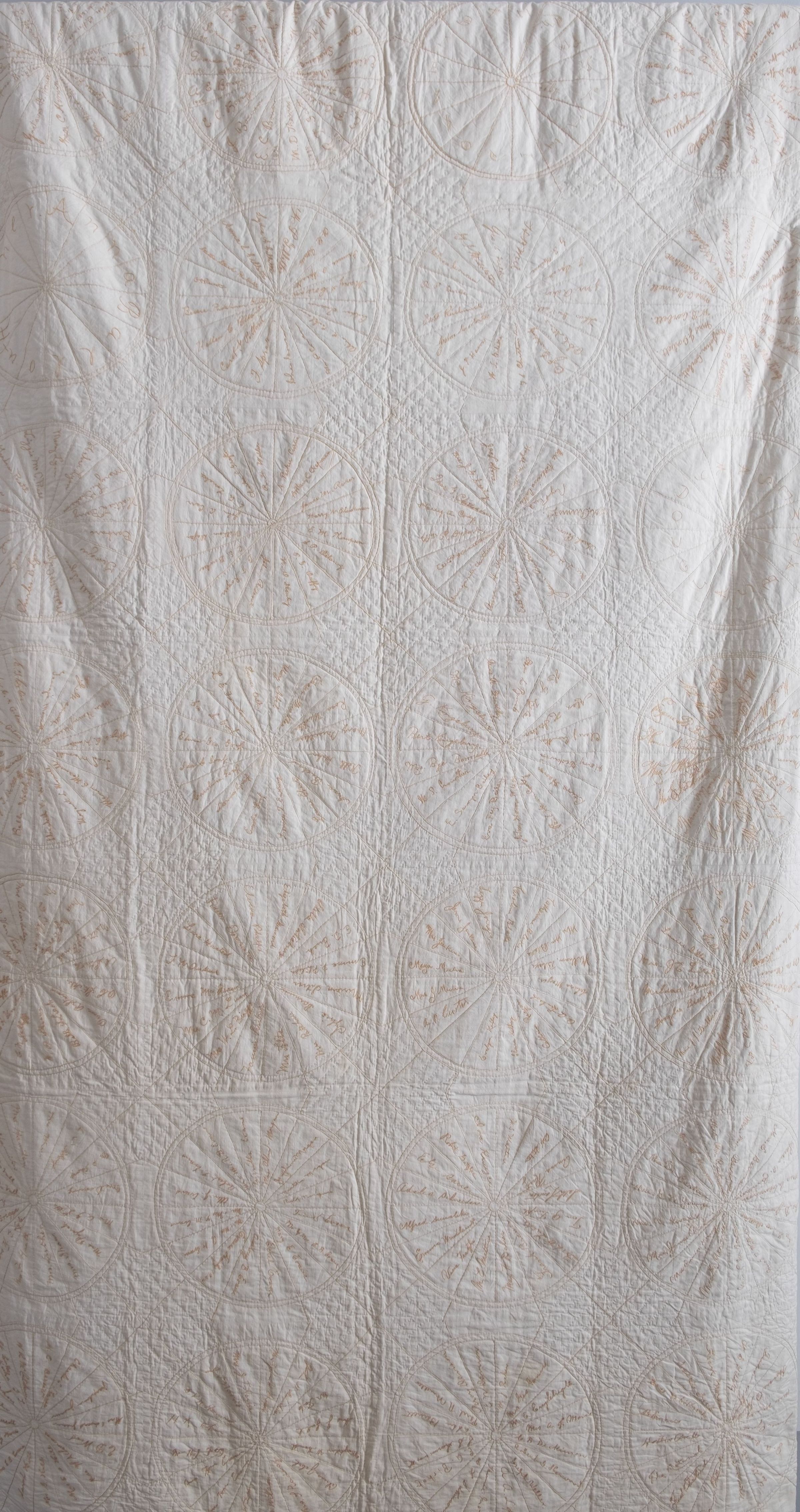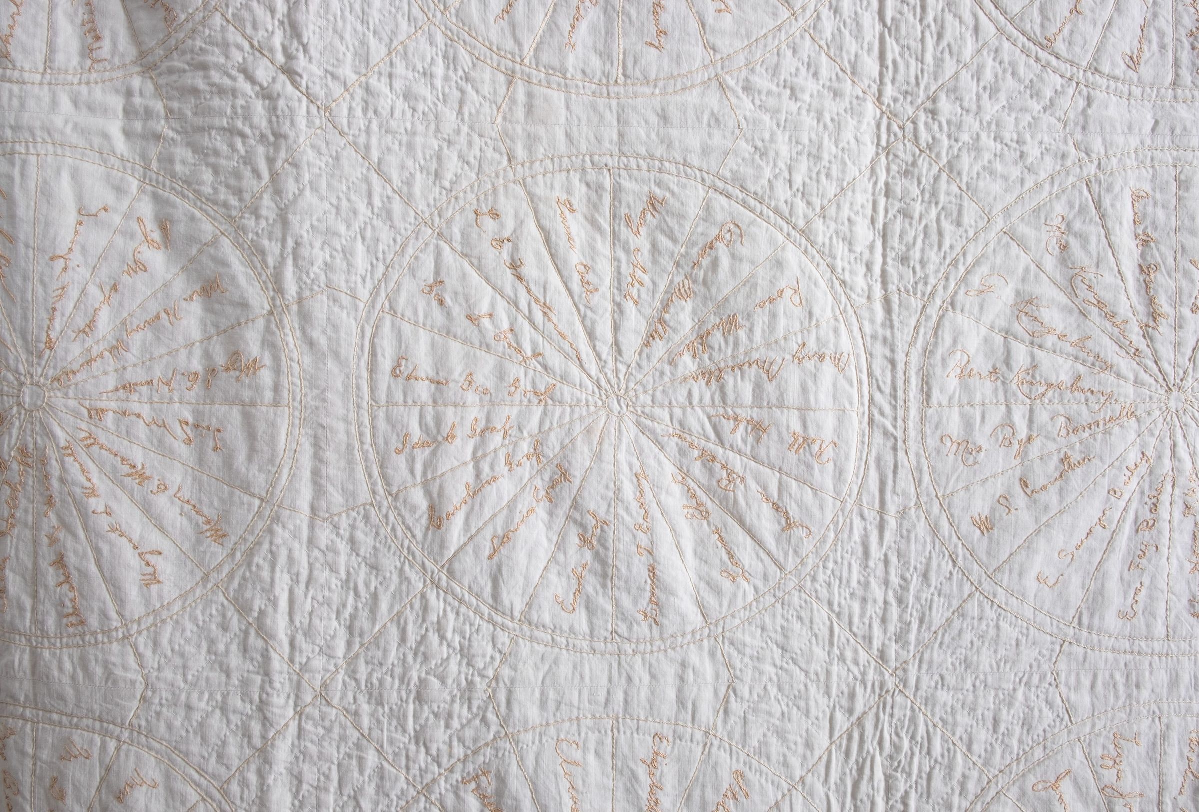 This 86" x 66" quilt is white cotton with gold colored embroidery signatures in 48 circles divided into 16 triangles. Four of the circles have just one name spread out in each triangle. The quilt is all hand sewn. The signatures are those of Ripon members of St. Peter's Church and include entire families. The quilt was made by the church's "Women's Circle" in 1903 as a fund raiser, according to a note found with the quilt. A few of the names included are Avis Mooney, Mary Evans, George Middleton and Anna Horner. The edges, fabric and embroidery are intact but yellowed and faded. Names are recorded on sheets with diagram kept in Donor's File for exhibit purposes. Quilt is stored with the Quilt Collection at Pickard House.