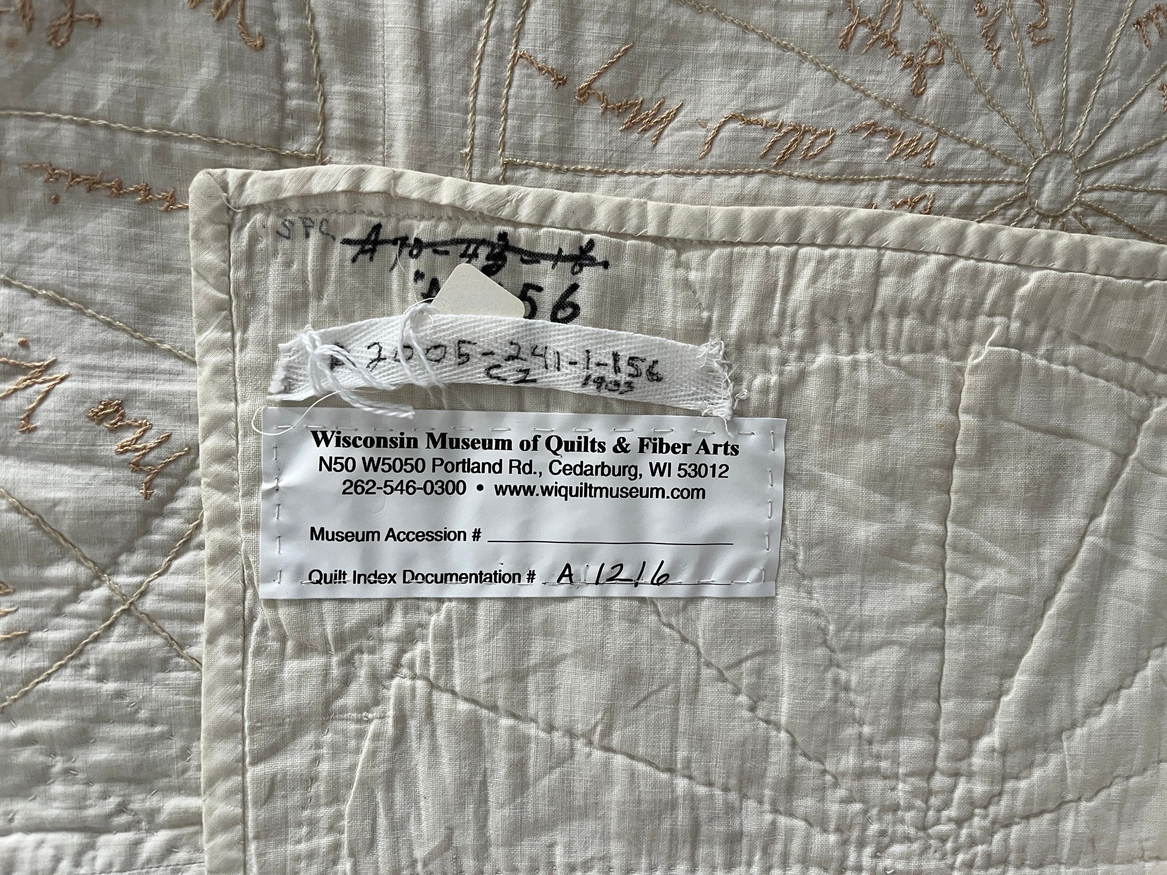 2017 Note: A1216: Added to National Quilt Index 2/4/2017 by WI Museum of Quilts & Fiber Arts, Cedarburg, WI.Collection