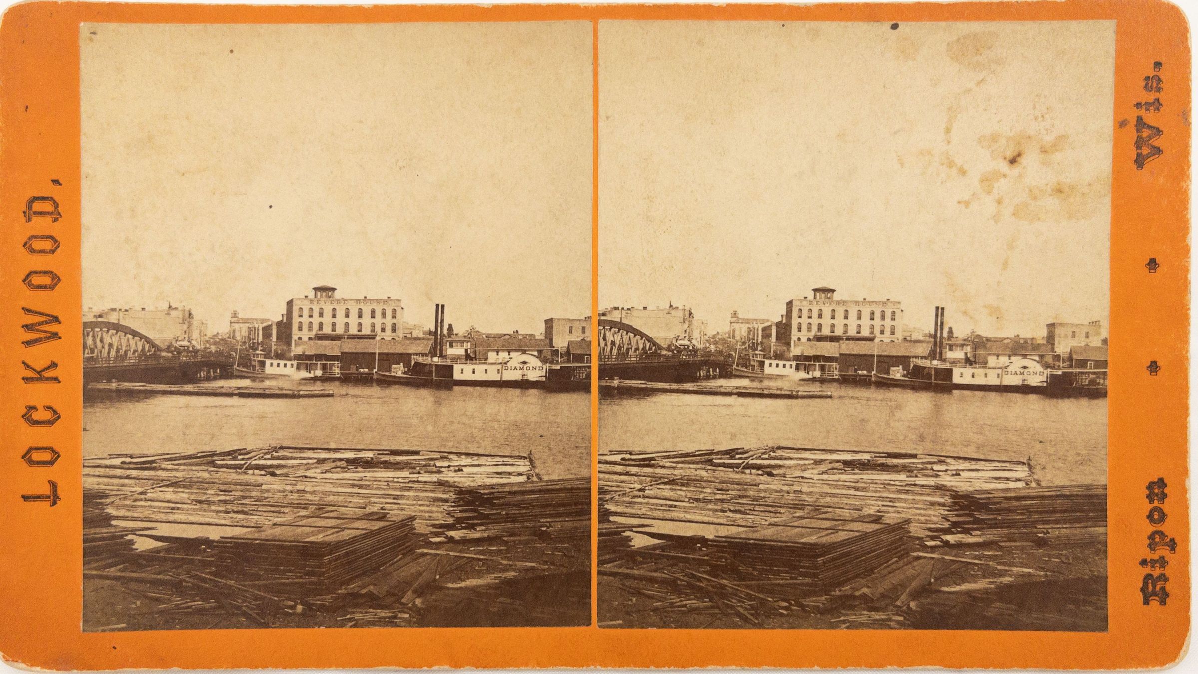 Lockwood stereograph Views of Oshkosh. Shows river and factory. Back says photographed by W.M. Lockwood. Sold by Allen & Hicks, Oshkosh. Size: 7 x 4.