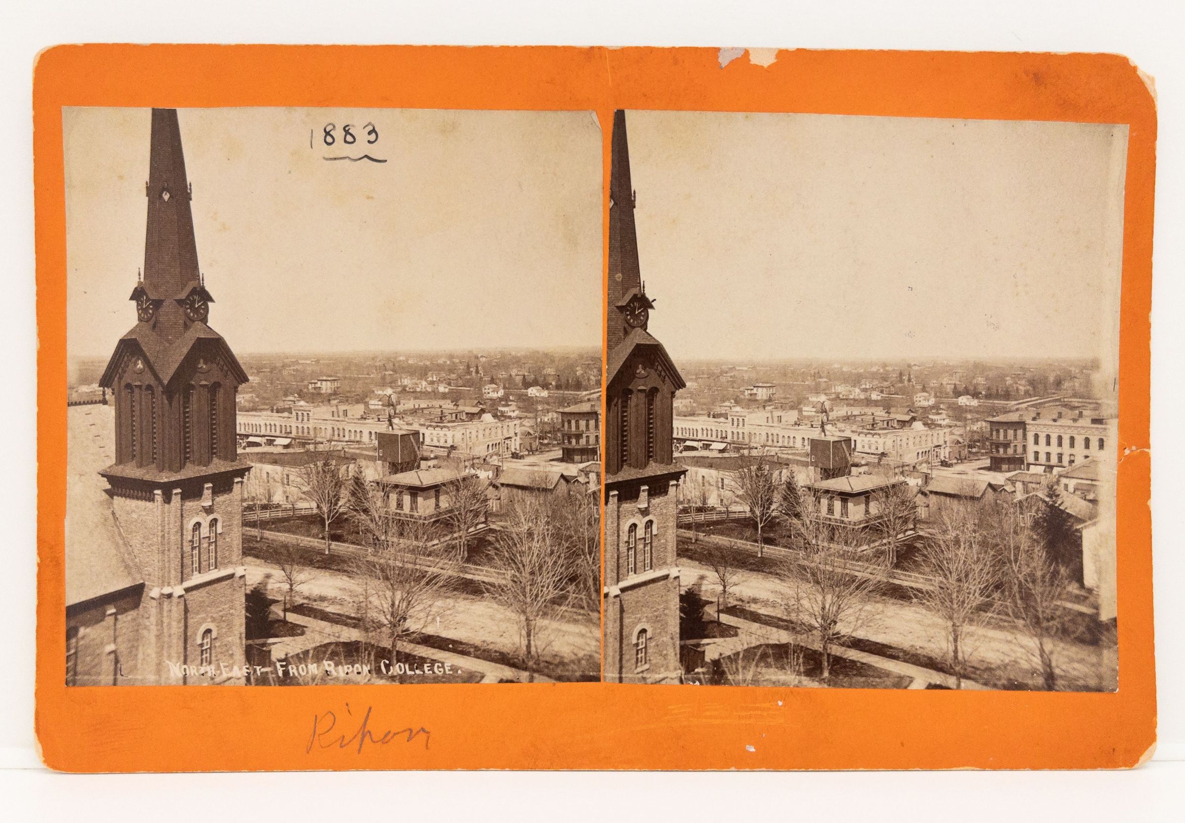 Sterograph looking northeast from Ripon College East Hall 1883. Congregational Church visible on left. Greenway's on right. 100 block Watson east. Ransom St. in foreground. Water "tower" with windmill. Also Ransom St. house and outbuildings.