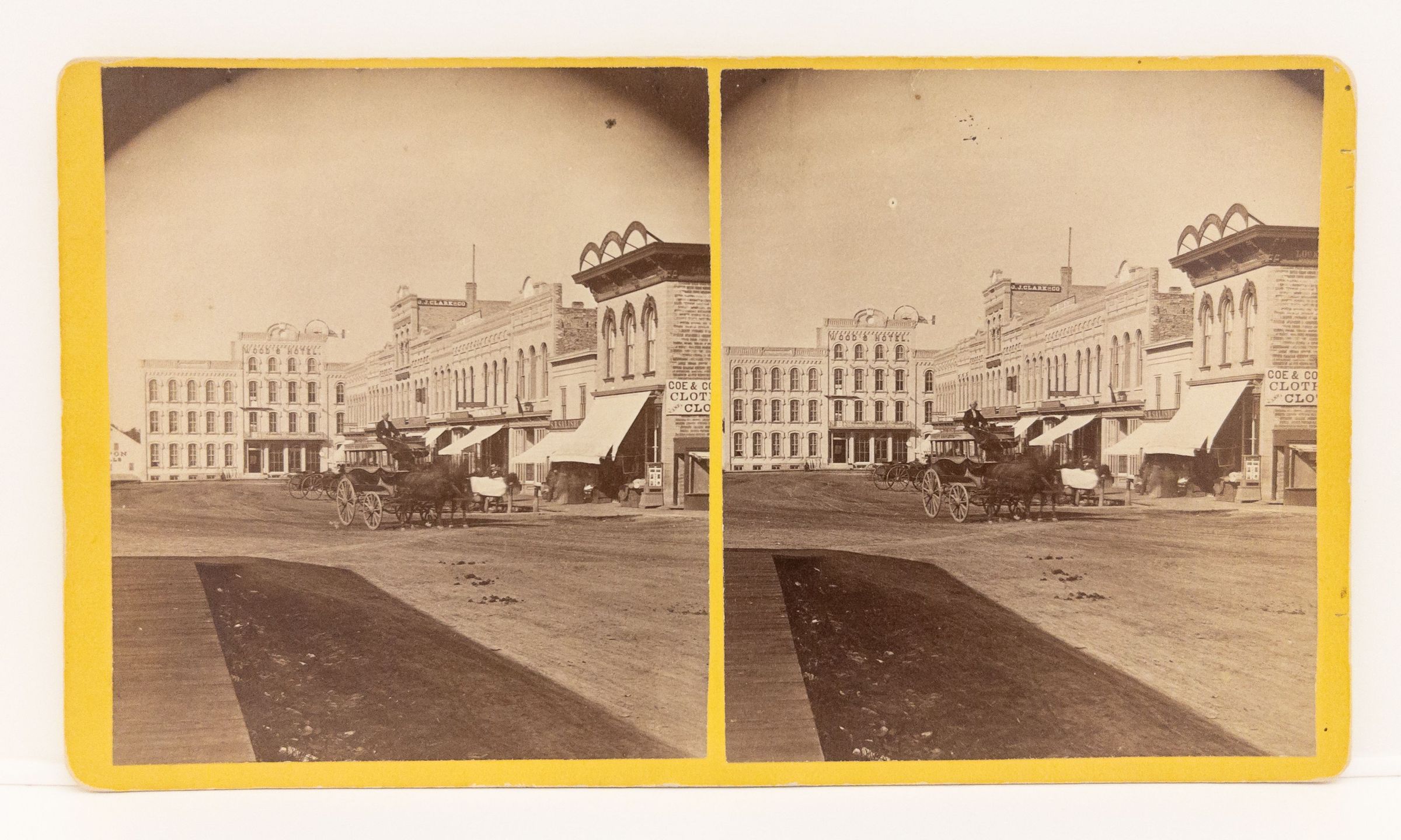 Stereograph of Public Square between 1869 and 1875 after east side 100 block burned and before Sumner block burned in 1875 (building that says Coe). Wm. Lockwood had his photography studio on 2nd floor and lost all his negatives in the fire. Salisbury's also burned. Other businesses visible: Woods Hotel, OJ Clark. Omnibus or hearse on street (name not legible).