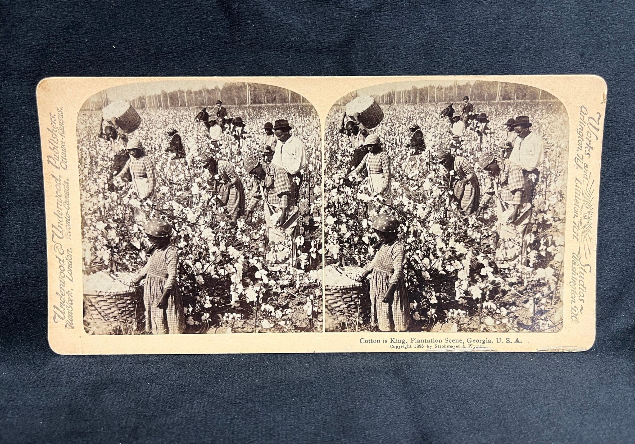 Stereoscopic photograph of plantation. Titled “Cotton is King, Plantation Scene, Georgia, U.S.A.