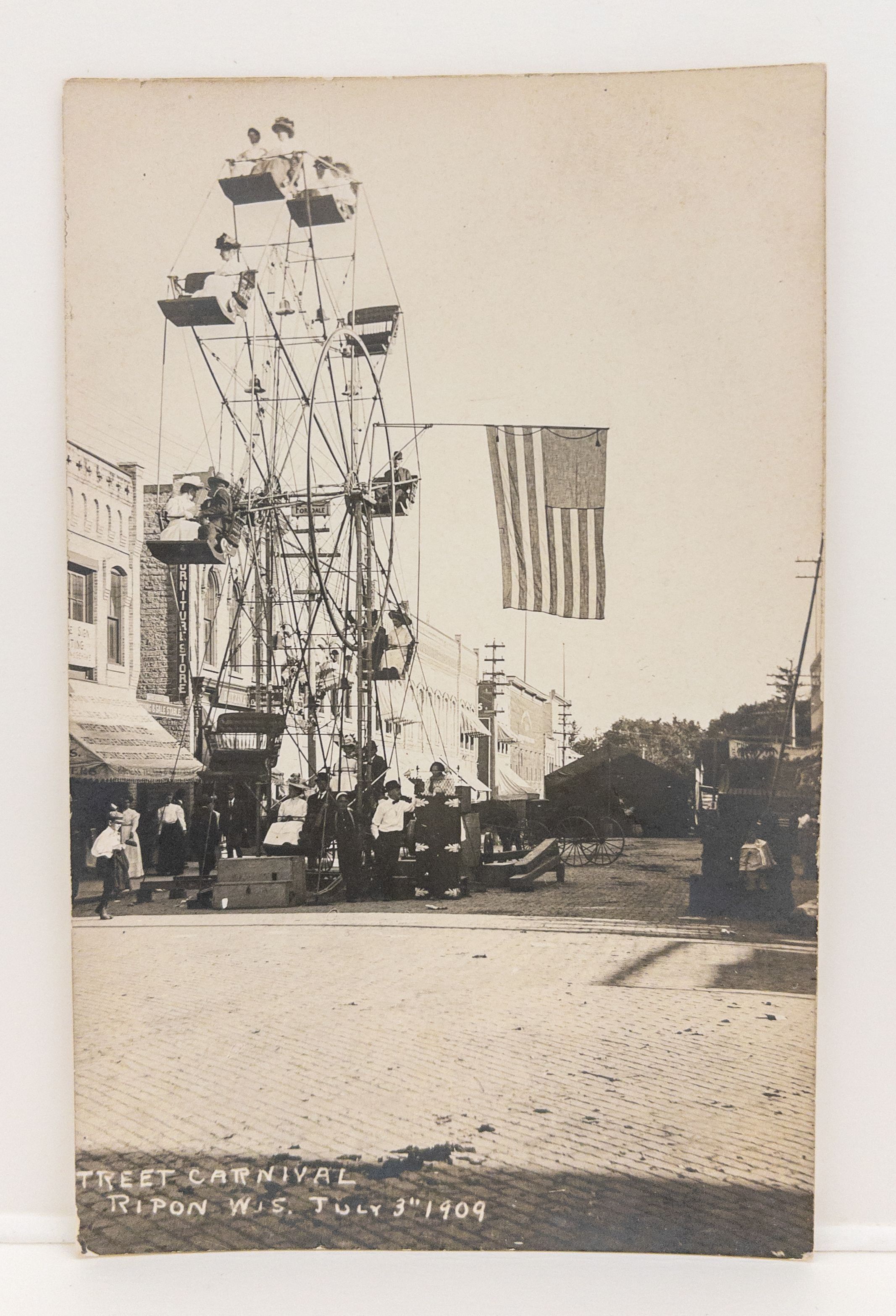 Black & white 3.5 x 5.5 postcard of Street Carnival, Ripon, Wis. July 3, 1909. Ferris wheel with riders visible. U.S. flag. 300 block east Watson. Butzin business sign visible.Acquisition