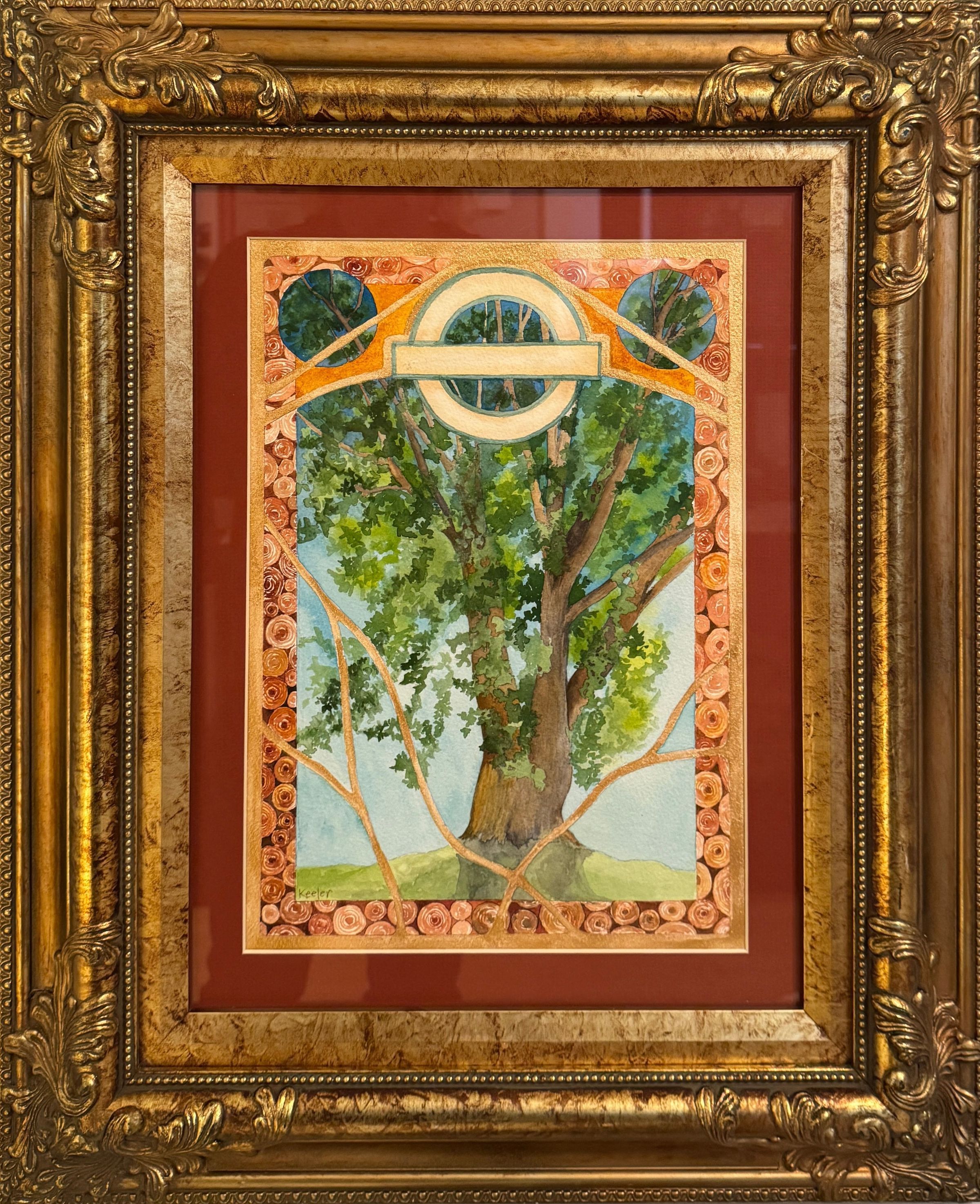 “The Rest of the Story" is the artist's attempt to enhance the viewer' s experience with a more decorative image than the original sign. "I was struck by the sheer utilitarian nature of the vintage sign and thought it would be fun to add an ornamental touch. As a woman working in the construction field, my aim was to appeal to a softer, more feminine audience." The title reflects both the introduction of these nonfunctional elements, as well as the recognition that lumber inherently derives from trees. The style of the piece was inspired by the work of Czech artist Alphonse Mucha (1860-1939). lt is watercolor and ink.