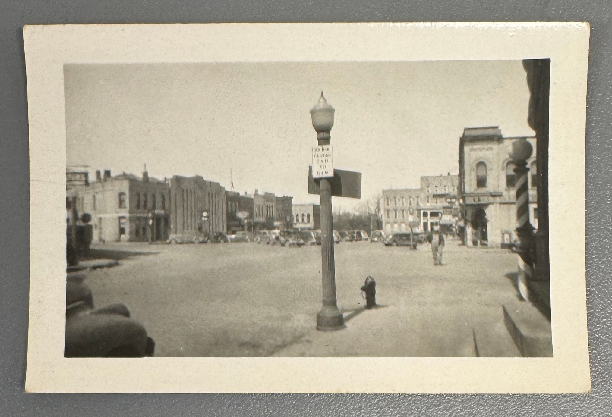 Black & white snapshot of the square looking north from 205 Watson. Grand View Hotel, First National Bank, Campus Theater, Vollmer's, Wisconsin Power & Light are all visible. Lamp post in middle of photo has sign that says 30 Min Parking 2 a.m. to 6 a.m. Fire hydrant also visible next to lamp post. Similar photos suggest lamp covers were changed to globes sometime in the 1940s.