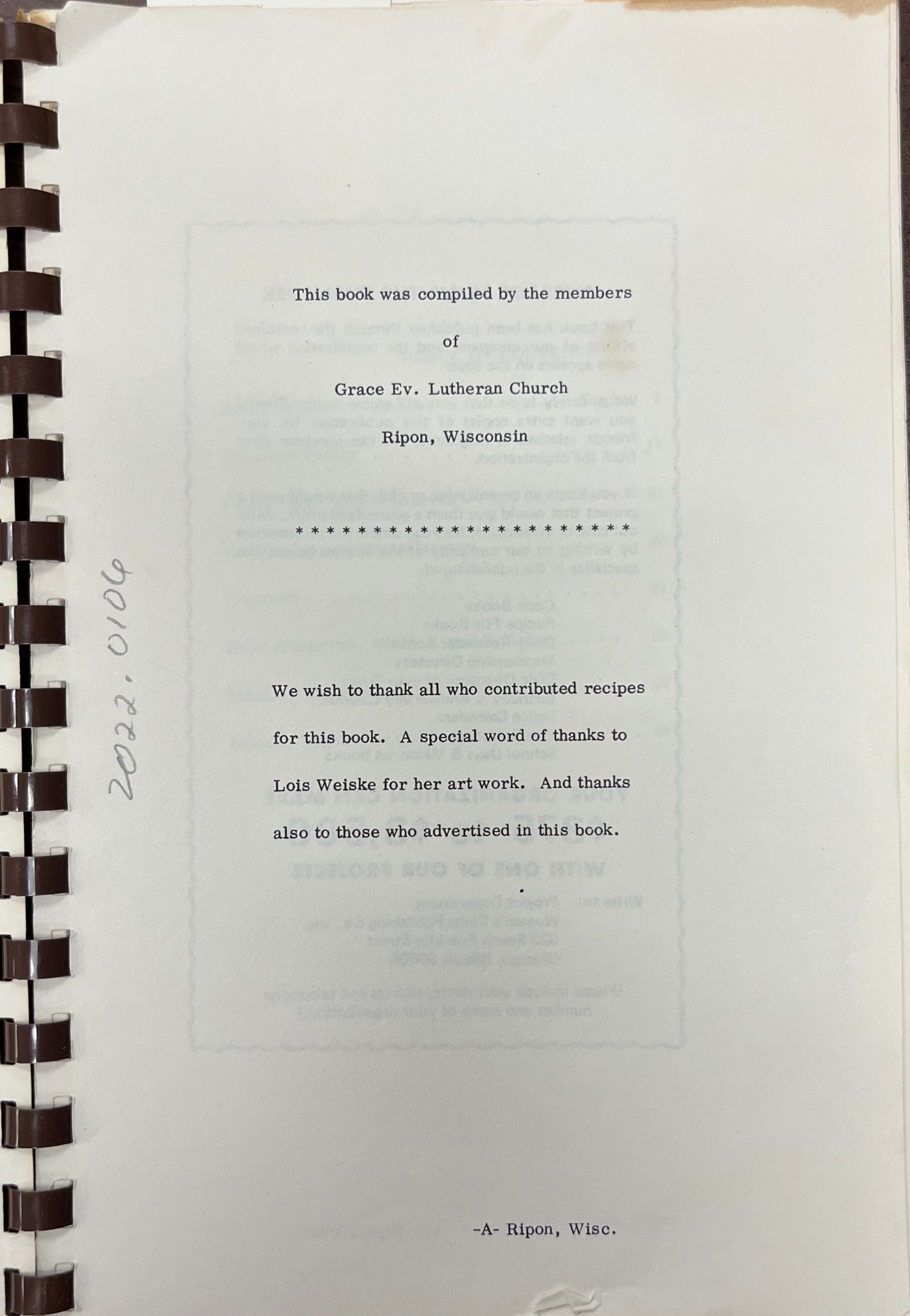 The Best from Grace Lutheran Church Cooks compiled by the members of Grace Ev. Lutheran Church, Ripon, Wisconsin