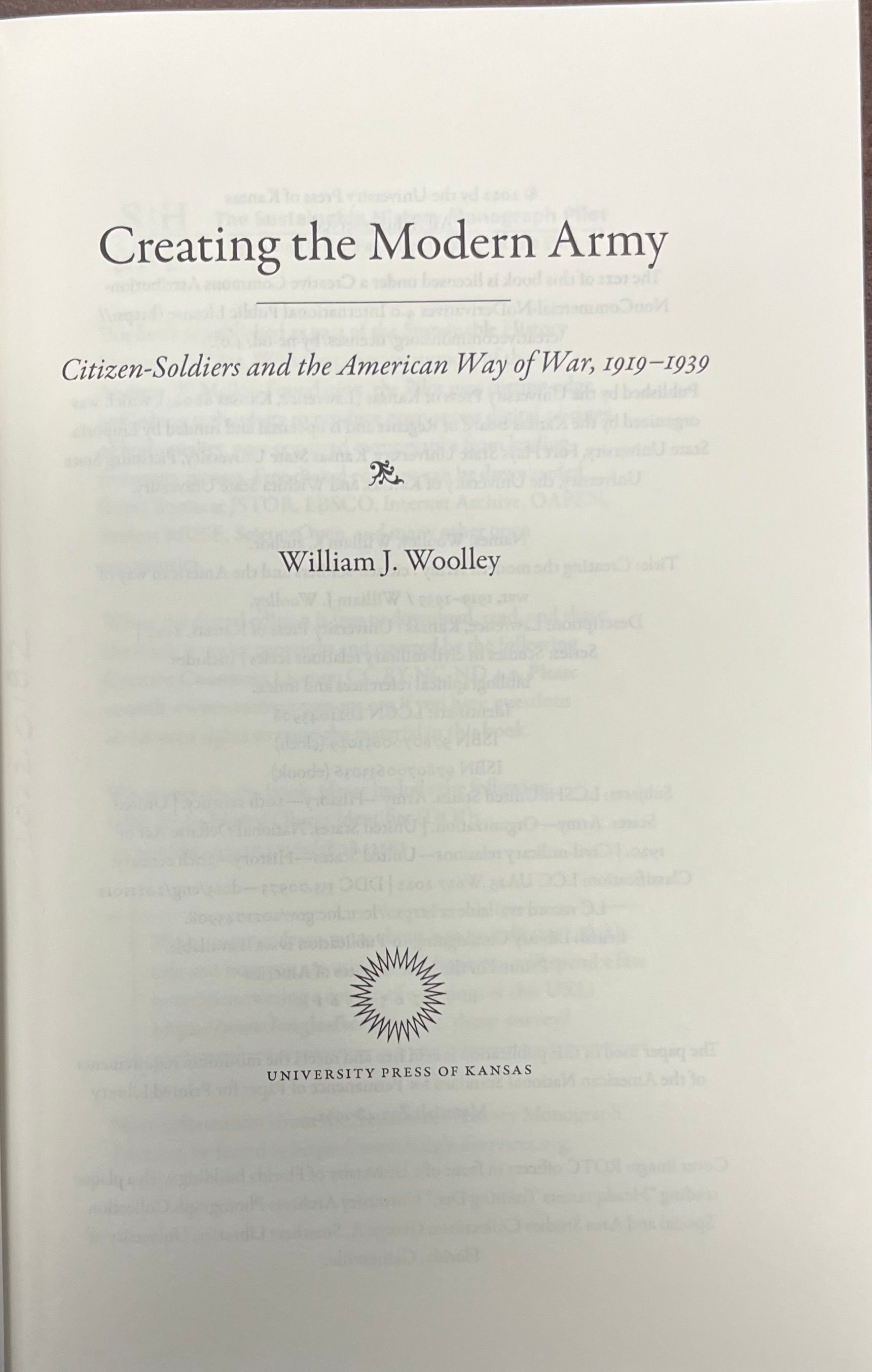 Creating the Modern Army; Citizen-soldiers and the American Way of War, 1919-1939 by Wlliam J. Woolley