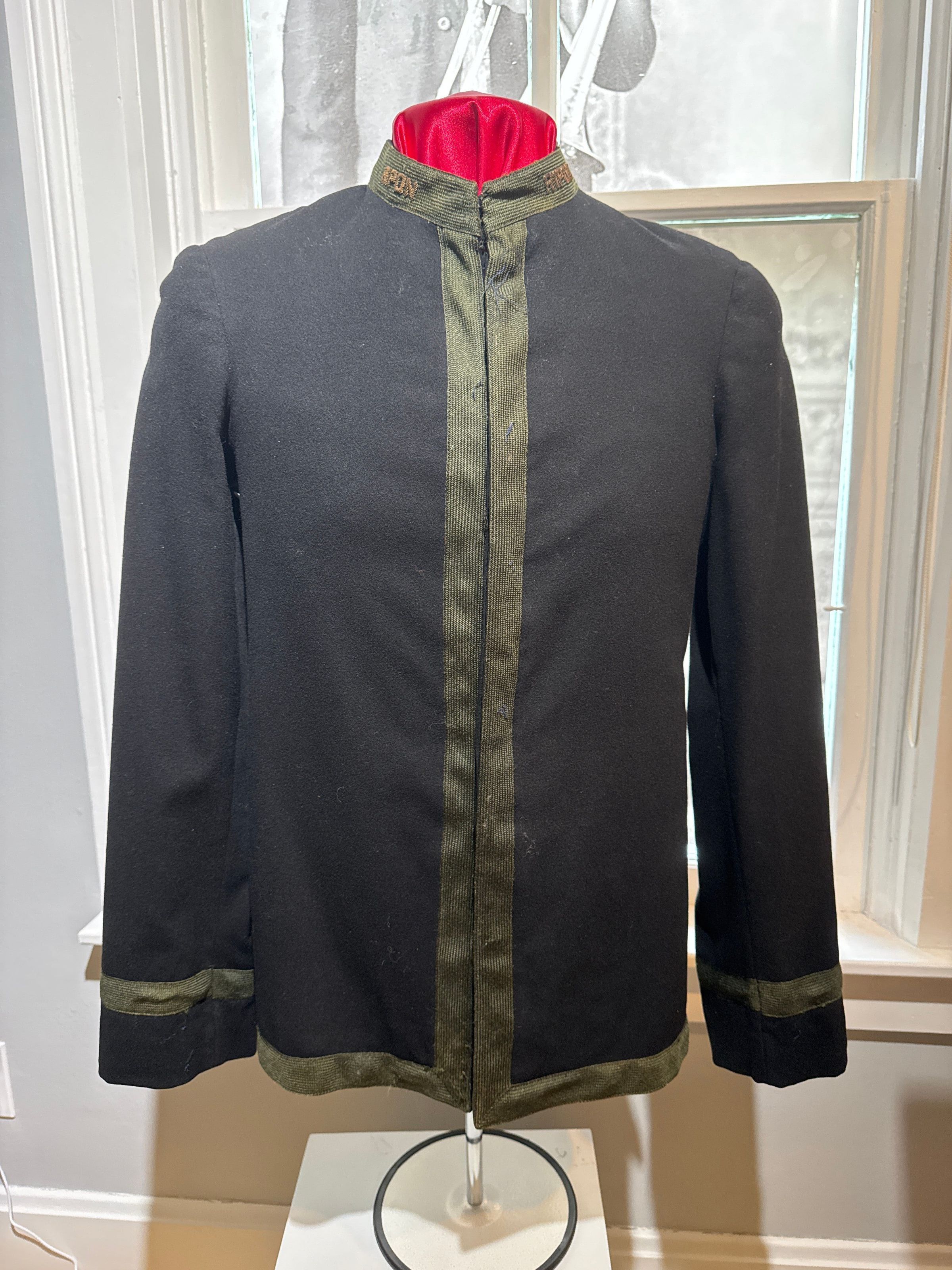 Ripon College band uniform - jacket only. Belonged to Otto Zobel. Navy jacket with green/gray edging & stripes up back. 7 black plastic matching buttons. 2 metal clips near neck and bottom. Ripon embroidered on edging around neck (twice). 2 inside pockets. Tag on right side with name and measurements. Torn. the pettibone Bros. Mfg Co., Cincinnati O on top tag. Inside lining on sleeves stained from age. Zobel written in ink on tag.