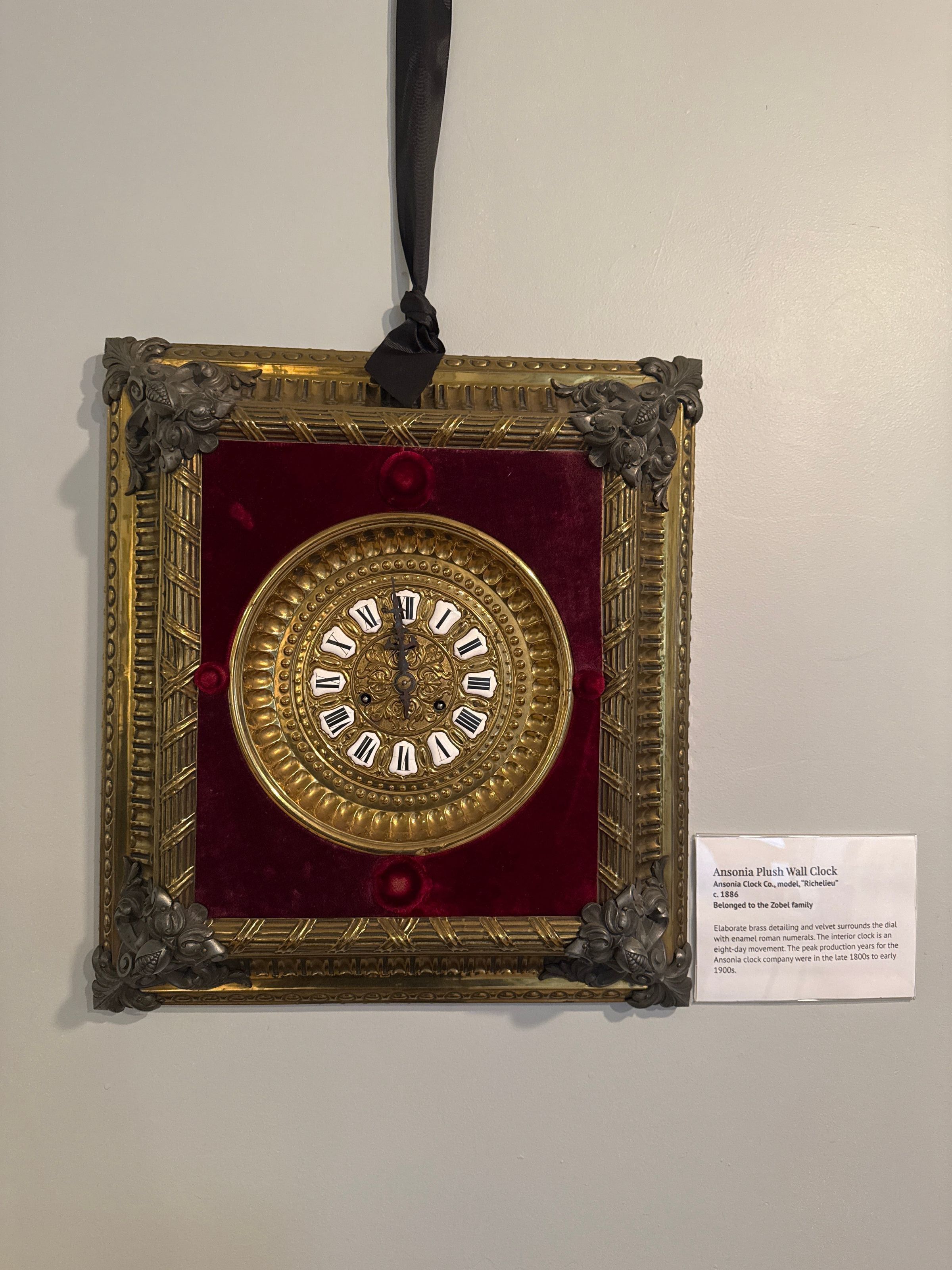 Ansonia plush wall clock, 1886. Made by Ansonia Clock co., model, “Richelieu.”