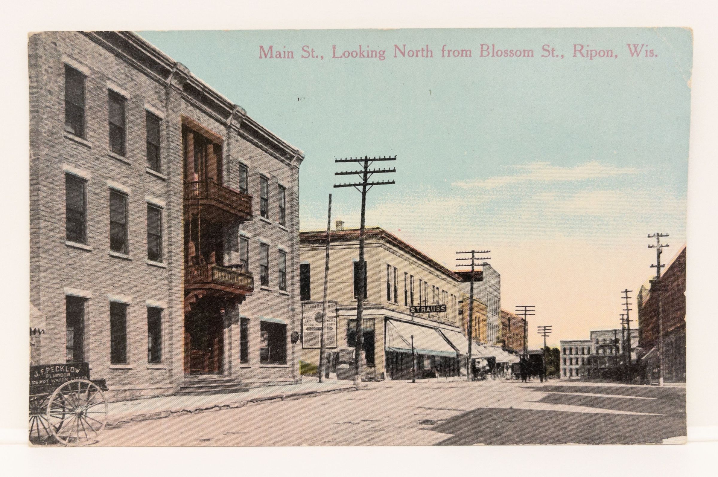 Colorized postcard showing Watson looking north from area of Watson & Blossom. Shows Hotel LeRoy, Strauss Bros., Hotel Engelbright, telephone poles. Face of card says Main St., looking north from Blossom St., Ripon, Wis. Addressed to Mrs. Ella Phillips from H. Scott. Postmarked April 27, 1915Acquisition