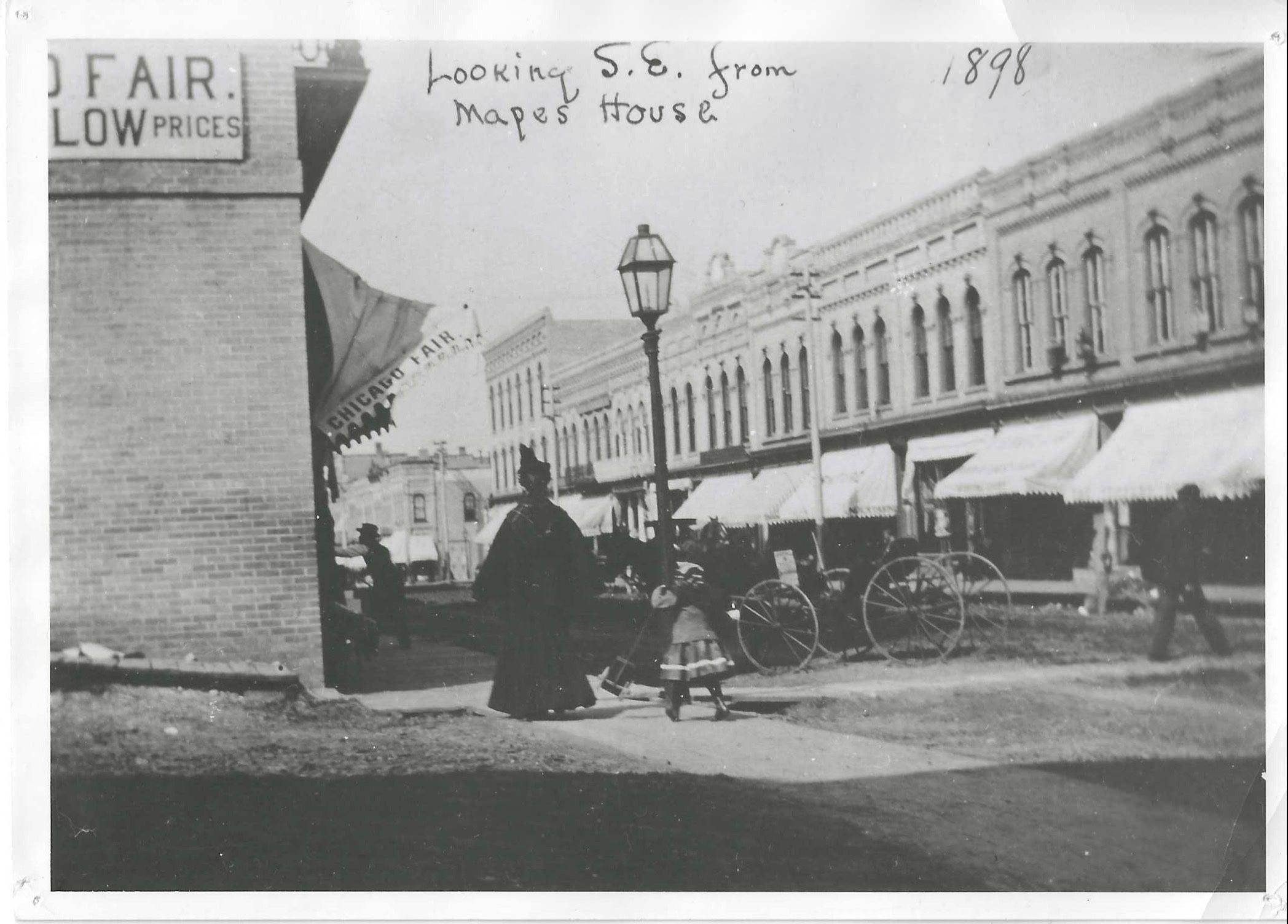 Black & white copy of photograph. Face says 1898 Looking S.E. from Mapes House. Photo is actually looking Northeast from "Mapes House" 300 Watson, corner of Watson and Blossom. Chicago Fair visible at left. Gaslight on Watson also visible.Acquisition