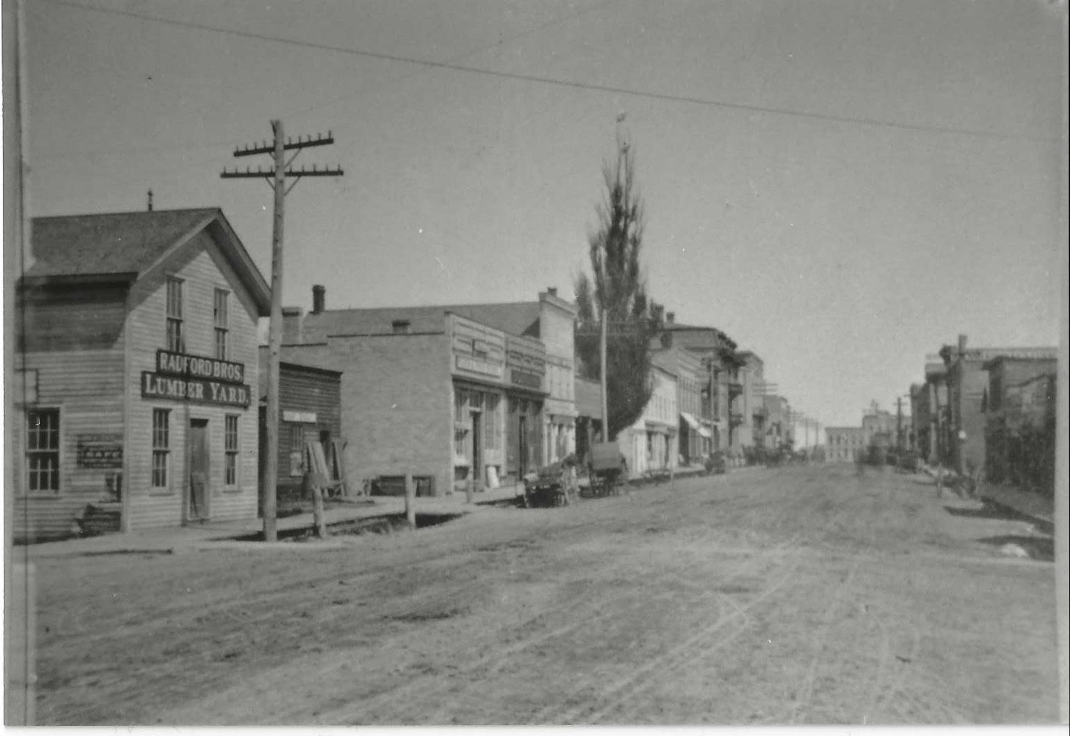 Black & white 3.5 x 5 photograph of Watson Street looking north from Seward. c. 1885. Radford Bros. Lumber Yard visible on left. Woods Hotel visibile in background. Undated. Established date based on another panoramic view of Ripon which included first high school and no building at northwest corner of Watson and Seward. High School burned in 1881. Ripon Knitting Works was established at this location by 1893 listing in City Directory.Acquisition