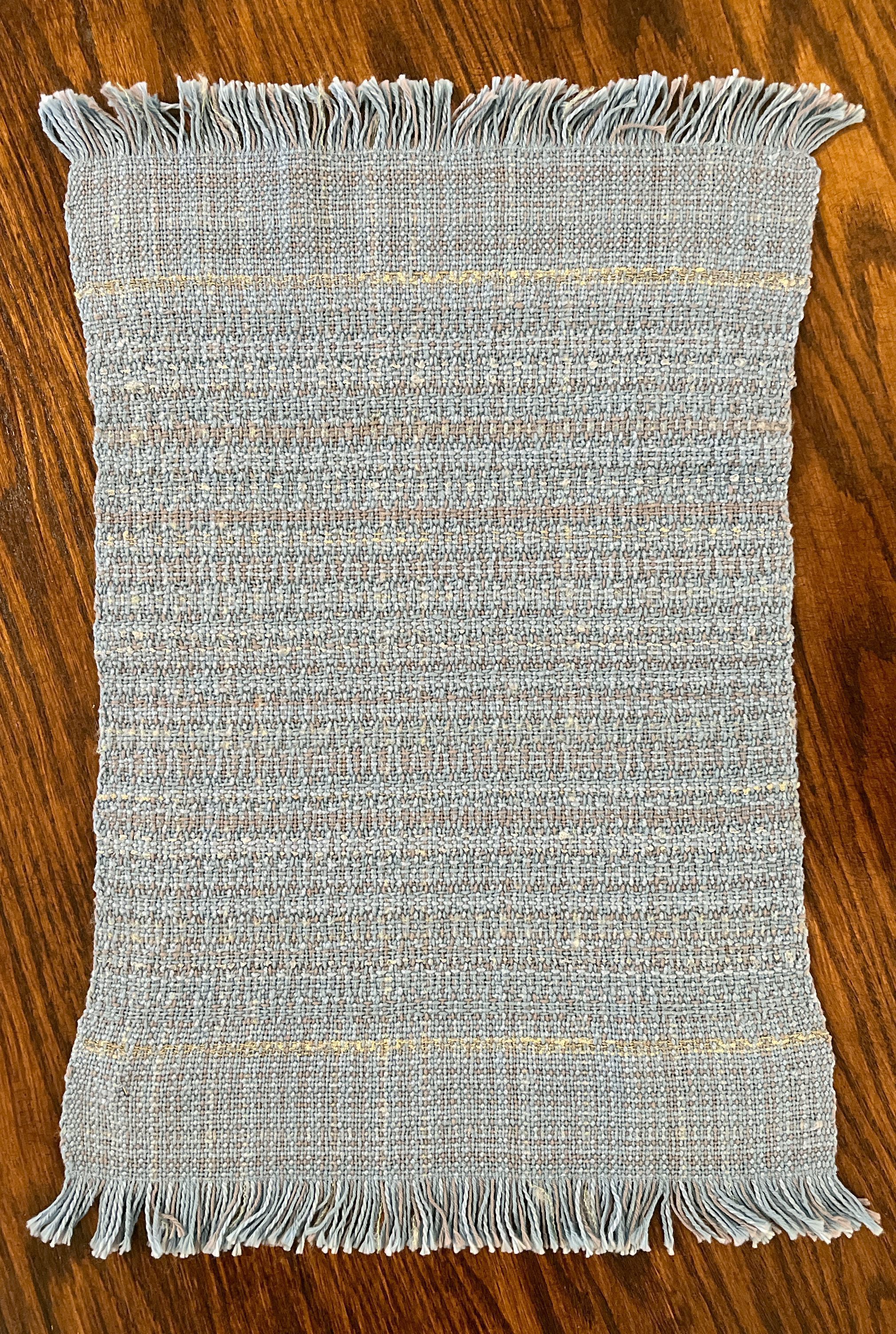 6 handwoven blue placemats 13" x 20". Handwoven by Betty Rasmussen. Placemats generally blue and gray with 1.25" fringes made of perle cotton. "Signed" in corners with stitching "BR".