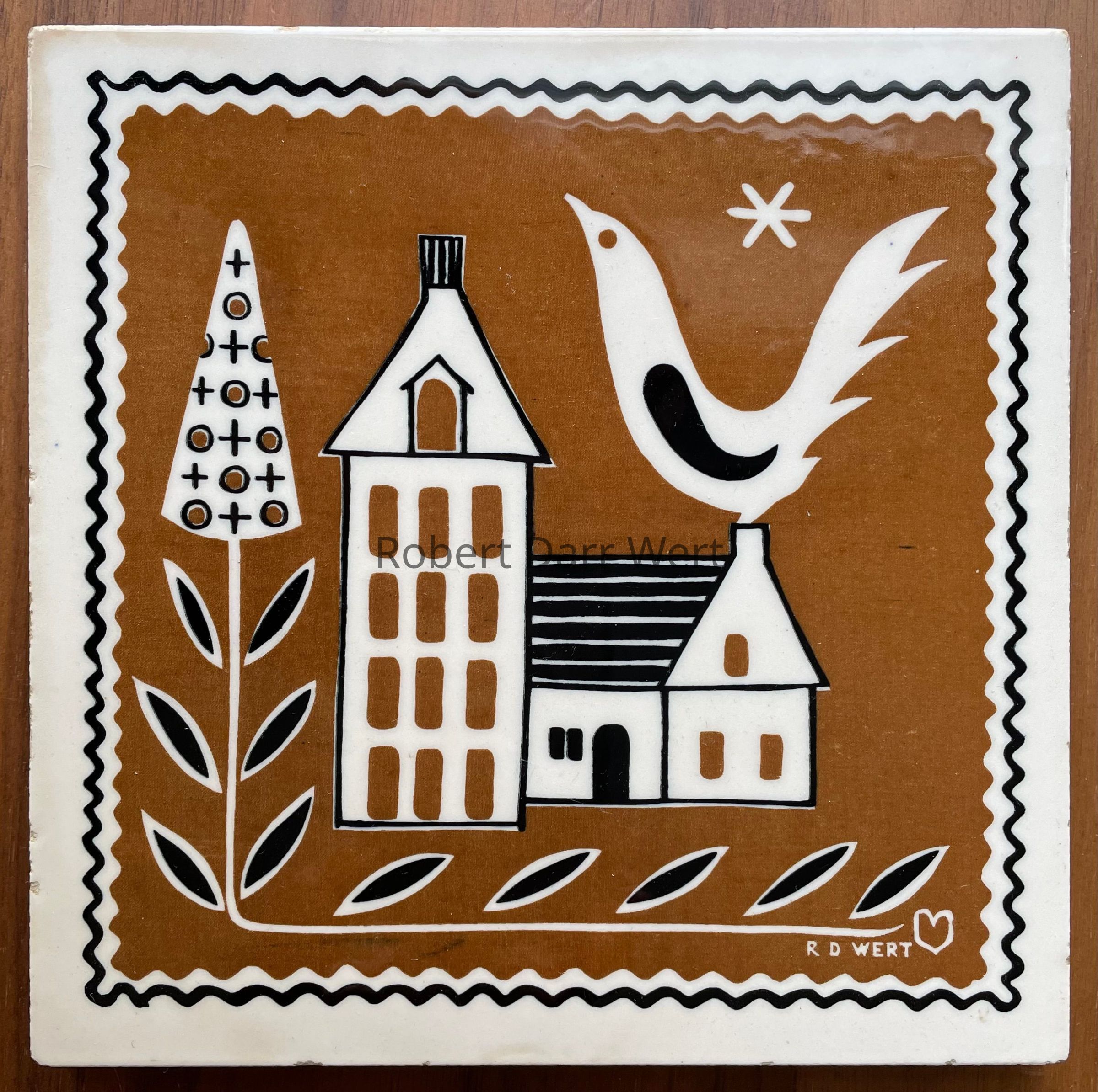 A two-color silkscreen underglaze print on a white tile blank depicting a large bird atop a house, and a trailing vine supporting a manicured tree superimposed with Wert’s interpretation of a calico textile pattern. The composition is framed with a rick-rack style border. It was produced in two colorways, blue and brown; see separate entries.