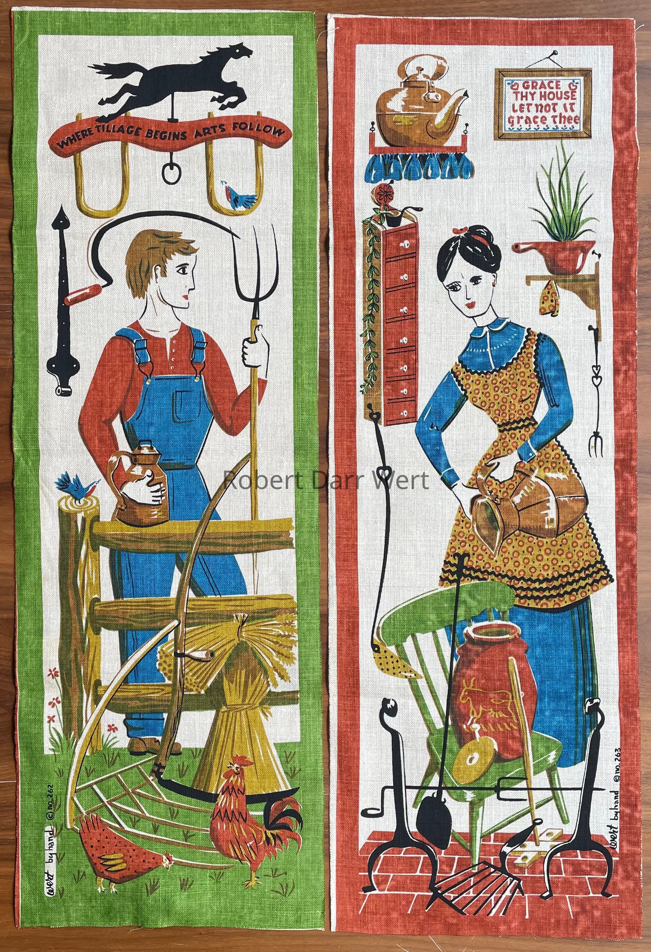 Strike-offs of two wallhangings with five-color silkscreen prints on white linen. These designs were produced as wallhangings and framed prints.Made/Created