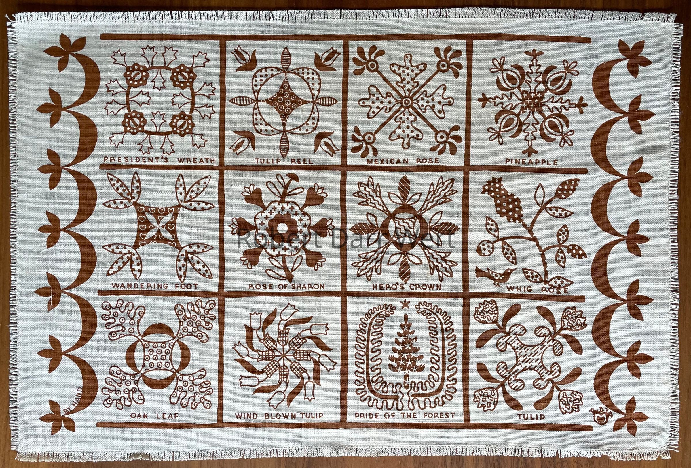 Placemat: inspired by Pennsylvania “Dutch” applique quilt work, twelve quilt blocks are portrayed in line drawings with pattern names on a 3x4 grid across the center of the mat. Swags at left and right are typically found as borders on appliqué quilts.