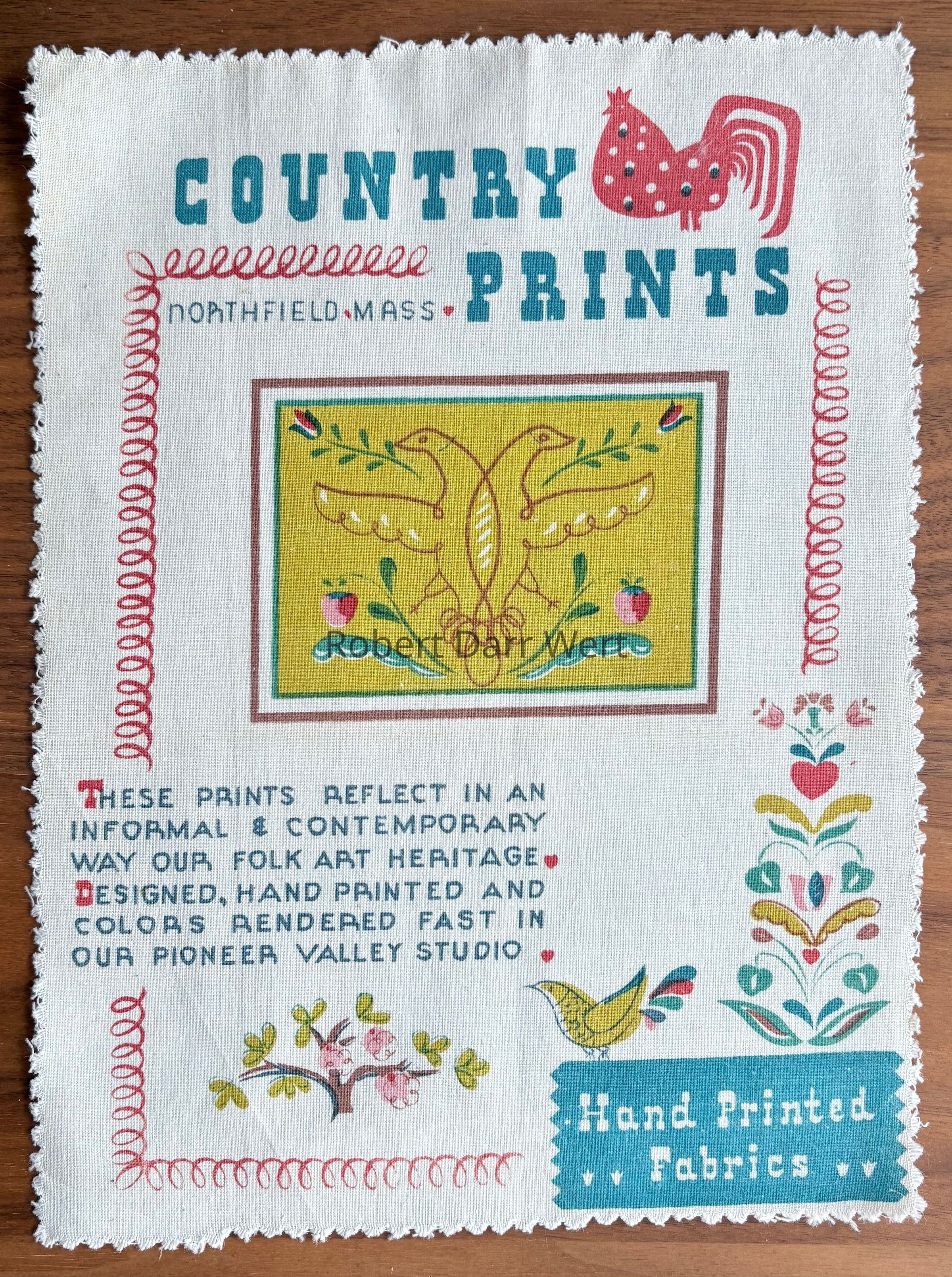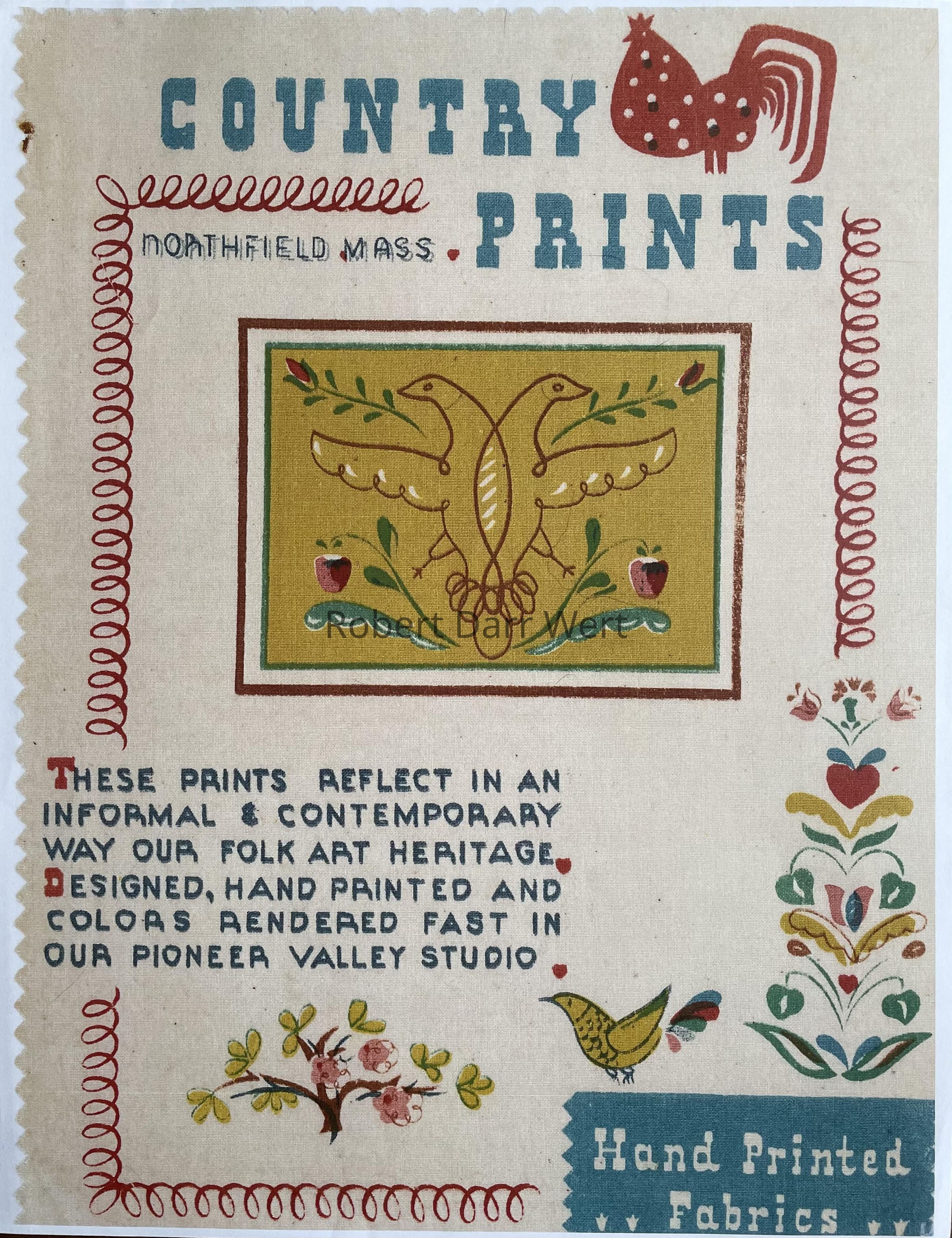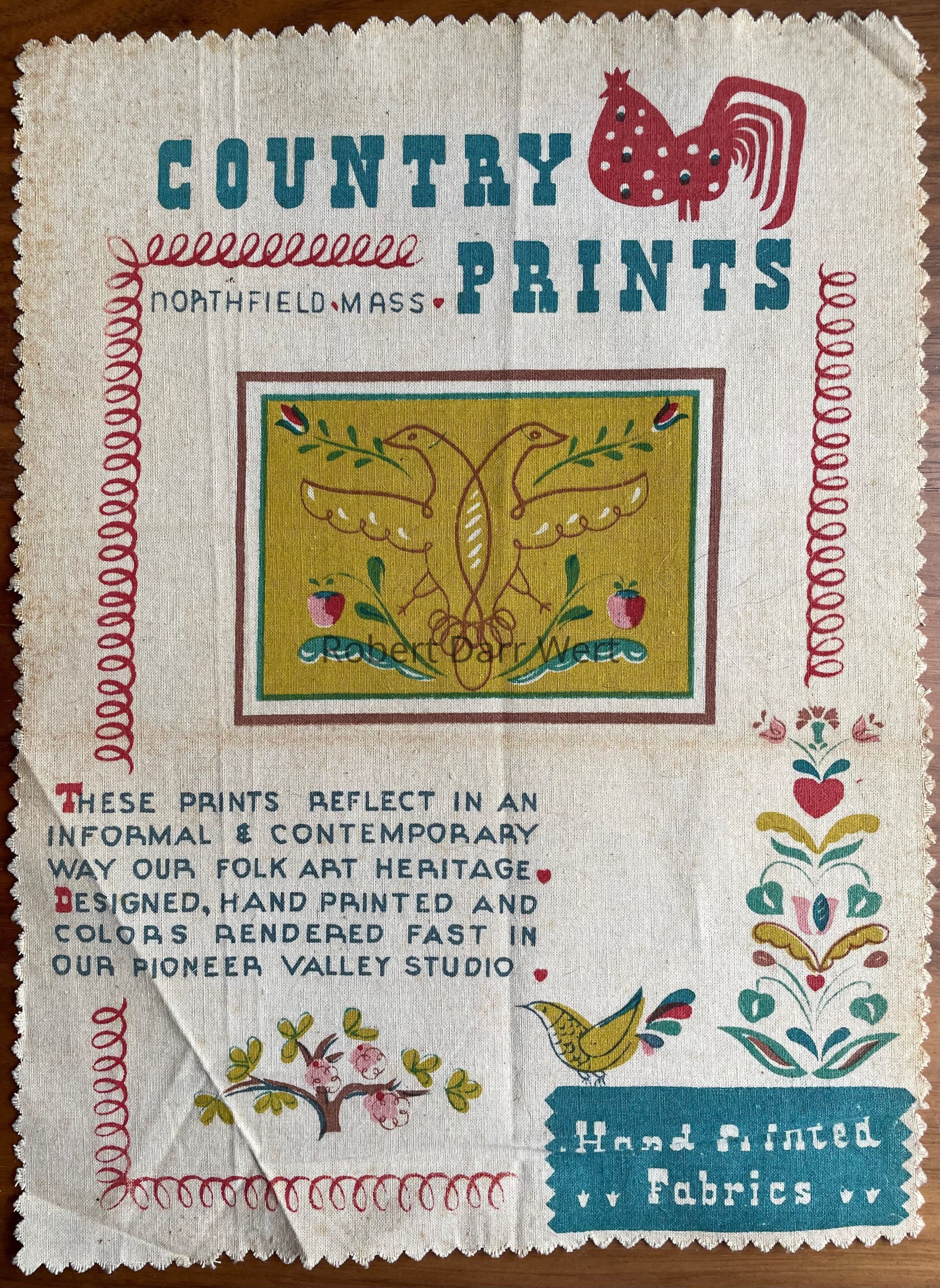A seven-color silkscreen print on fine weave cotton or linen featuring the Country Prints rooster trademark at upper right. This is one of Country Prints’ first brochure covers/promotional pieces produced in the Northfield MA studio, and does not include Robert Darr Wert’s name.Inscription/Signature/Marks