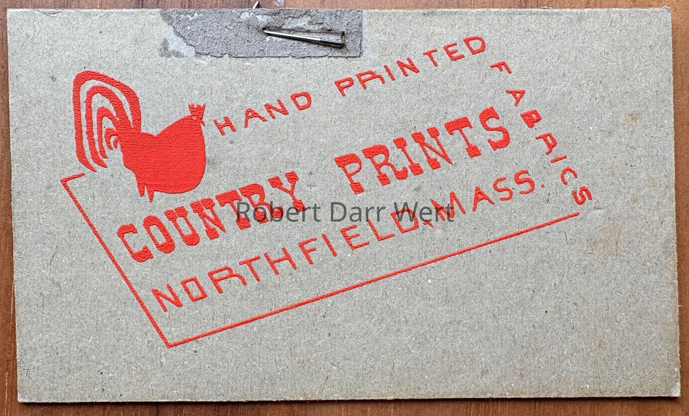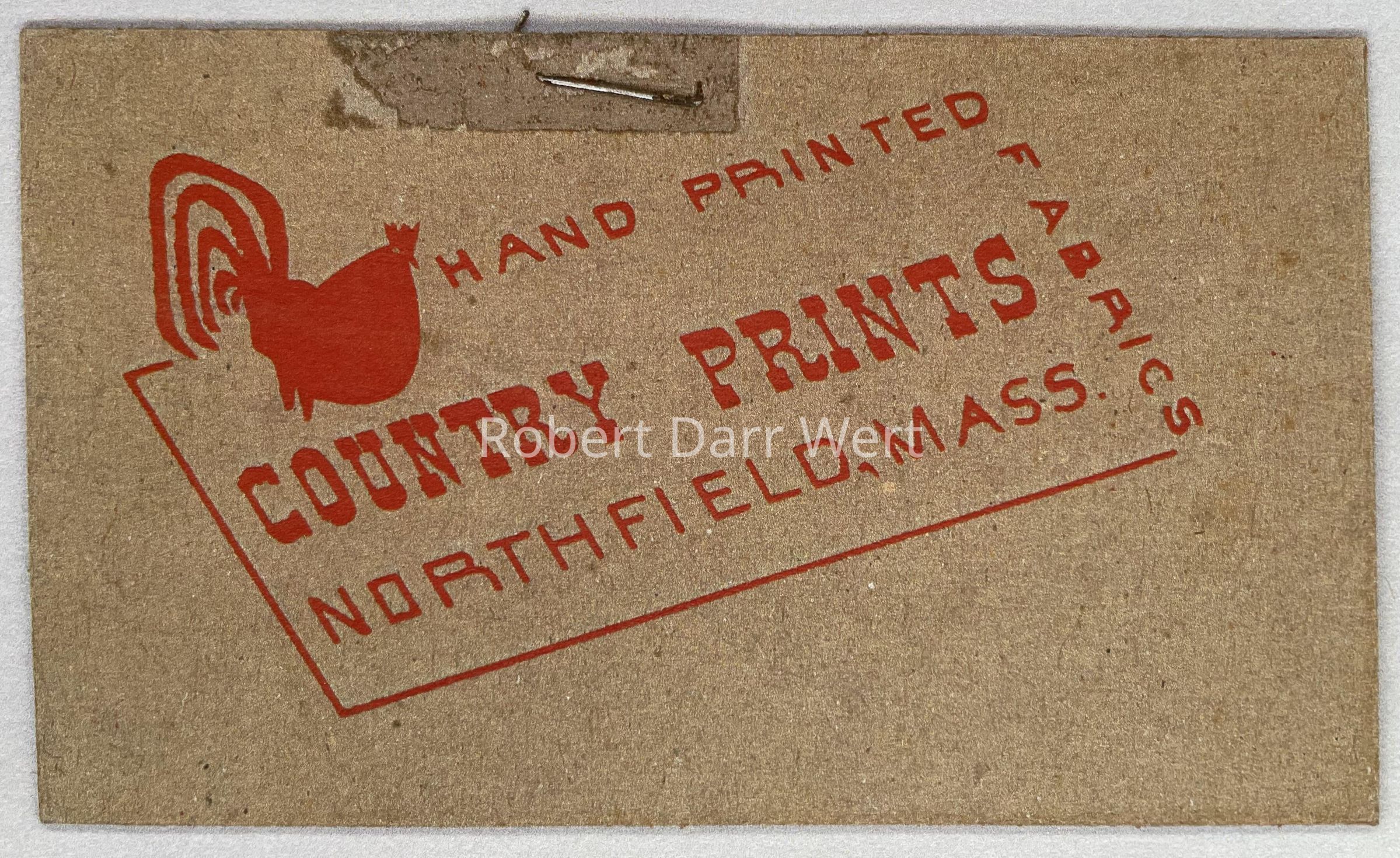 “Country Prints, Northfield, Mass.”, and “Hand Printed Fabrics”, all in red, with rooster.Colors