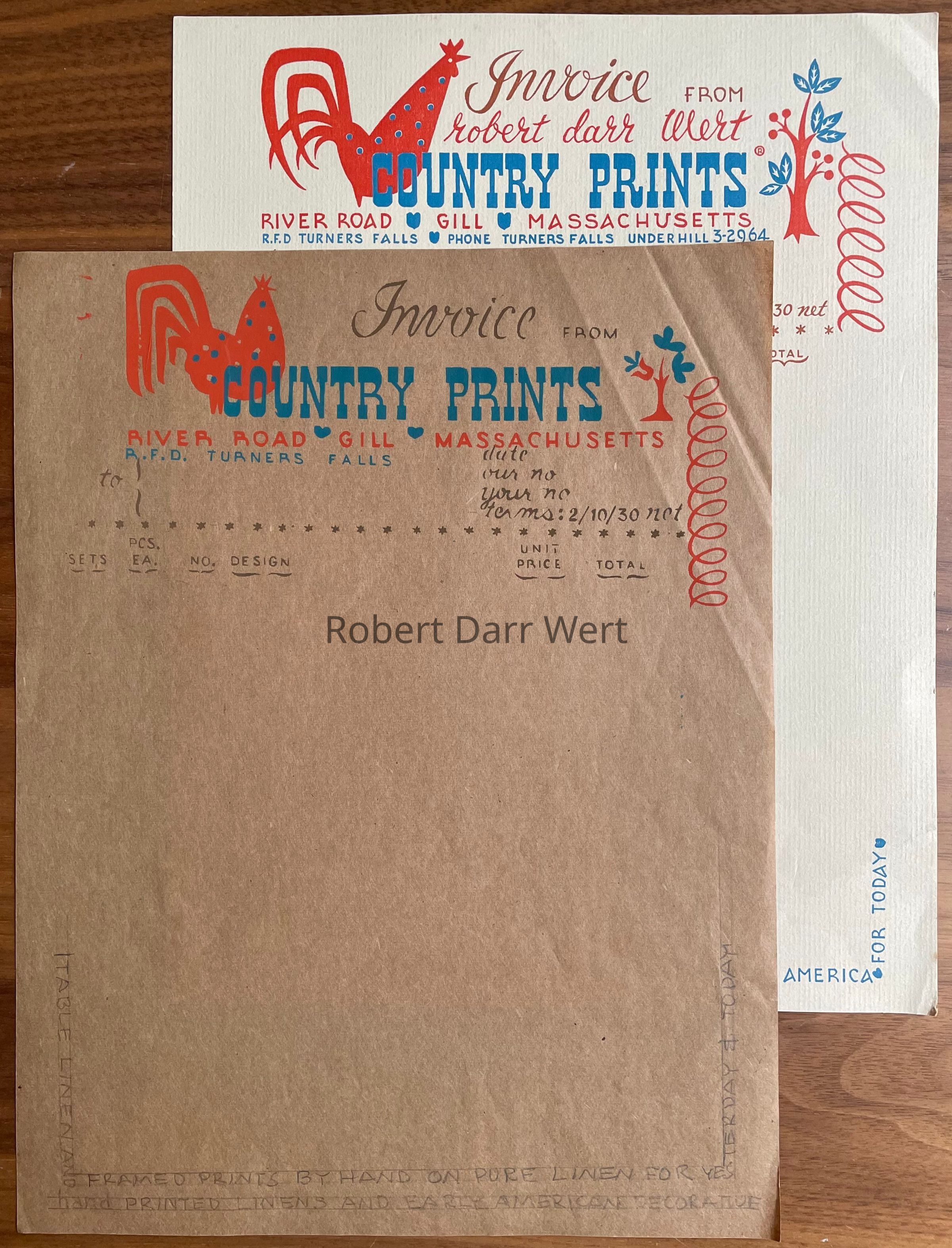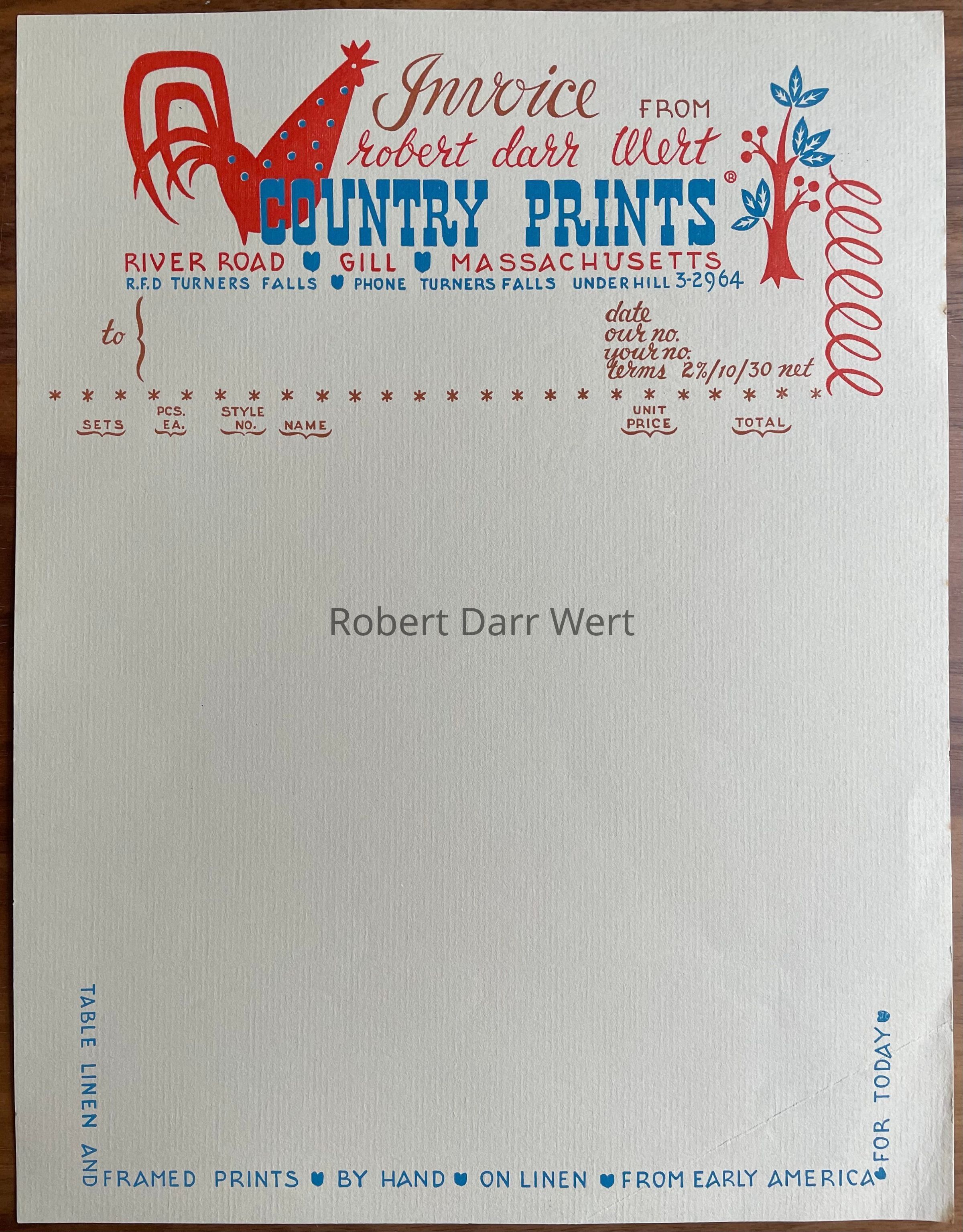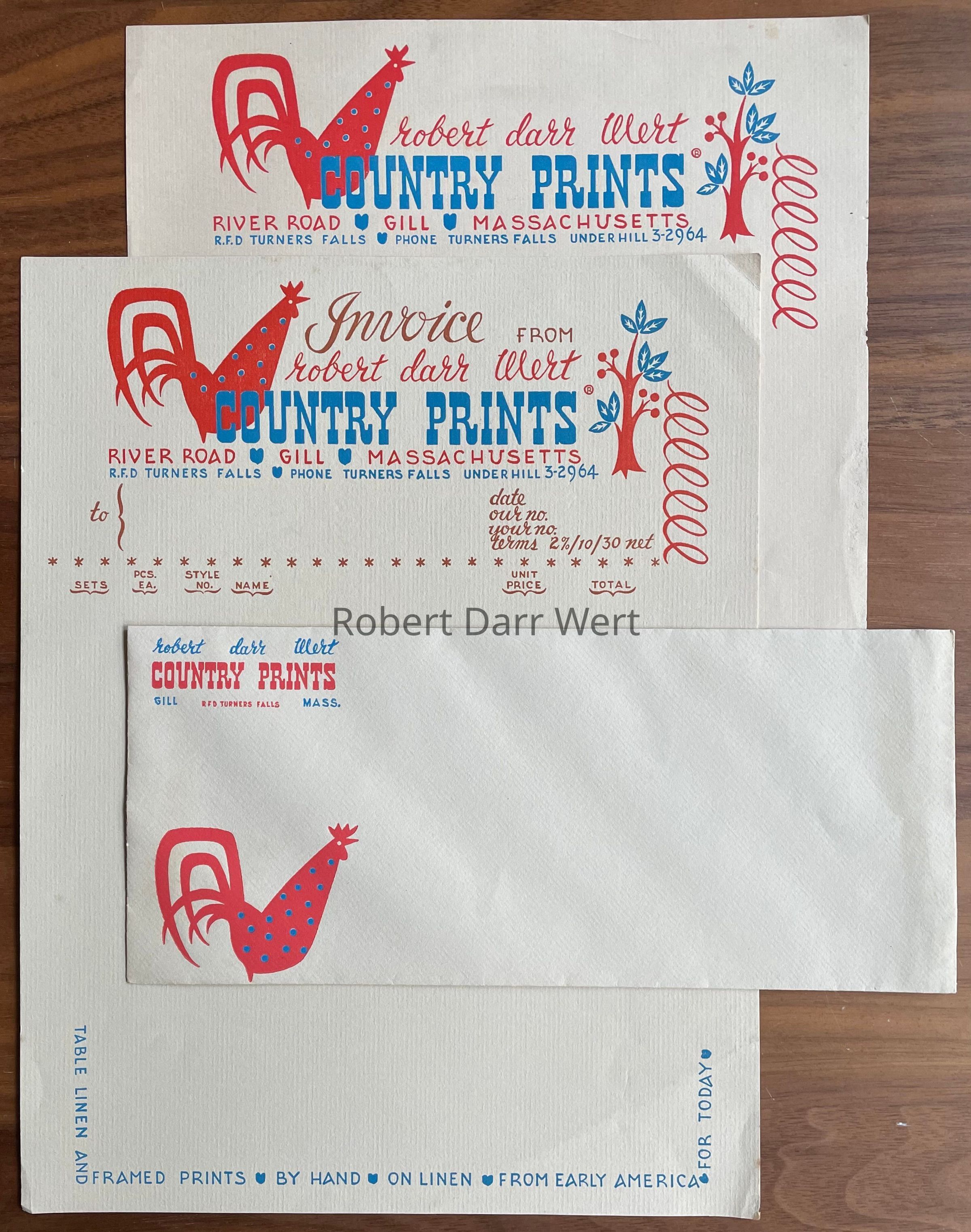 Country Prints letterhead, invoice sheet and envelope. In a departure, rather than silkscreen printed in-house, this set is letterpress printed on lightly textured tan laid paper. This likely reflects the rise in production volume at Country Prints, leaving less time to silkscreen print the company stationery.