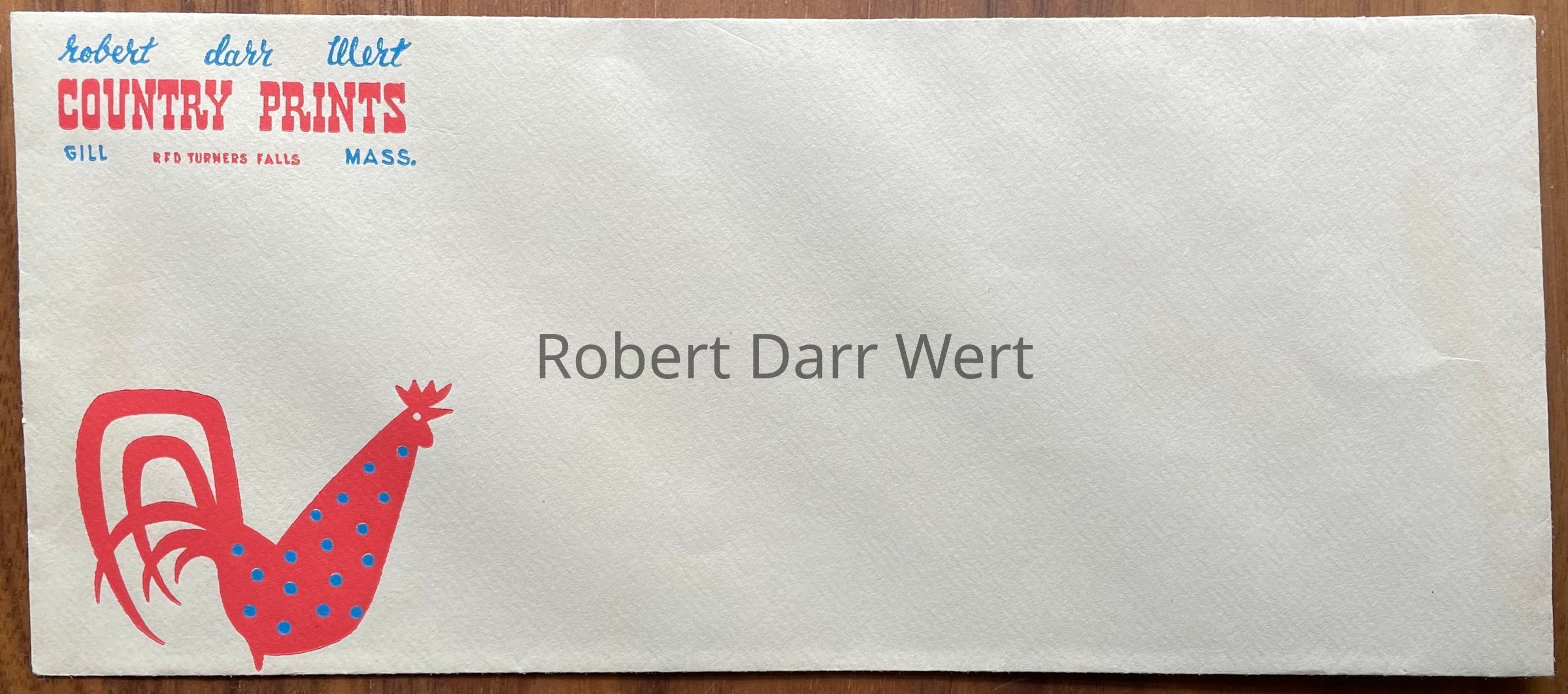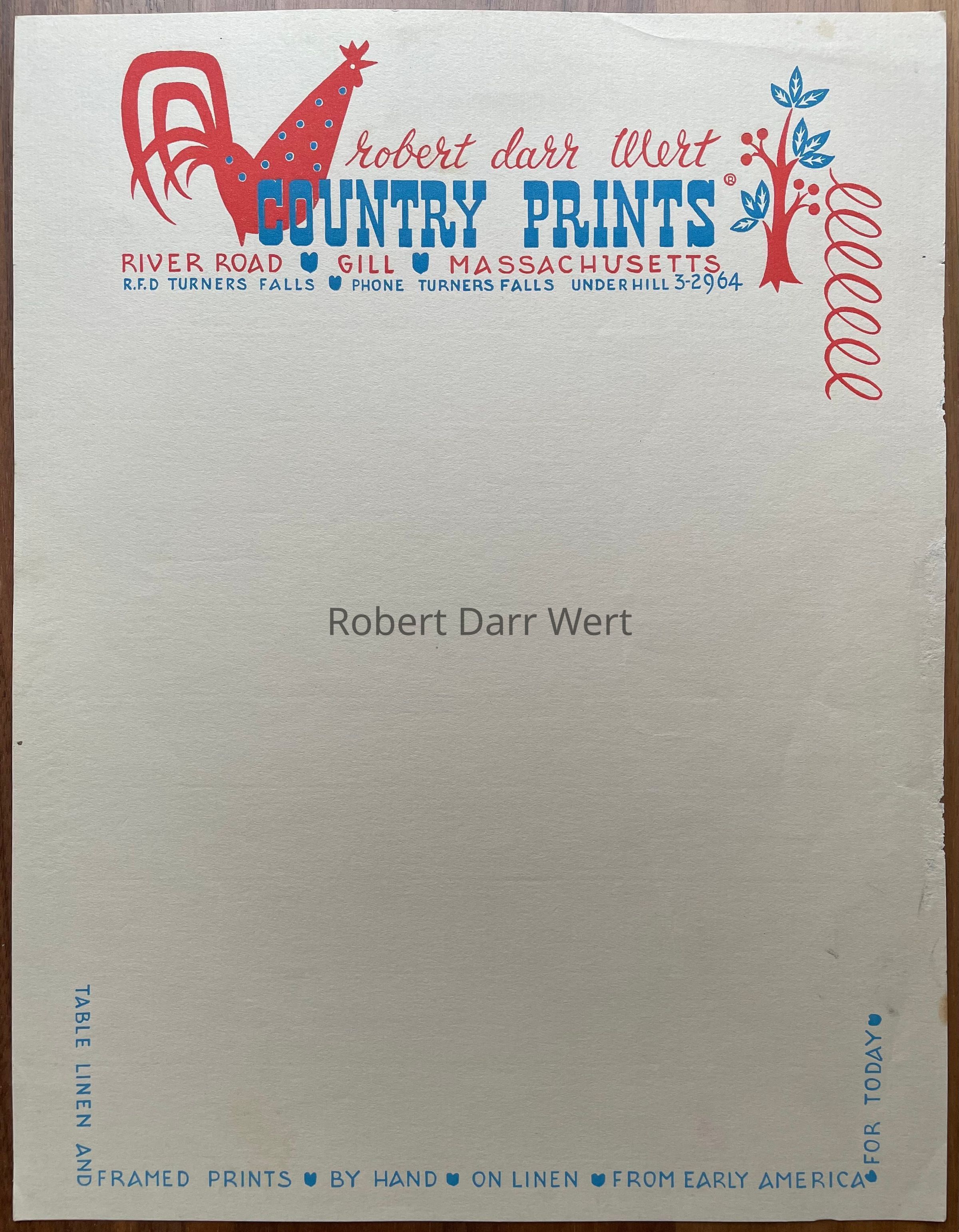 In this design revision “robert darr wert” is added above “Country Prints”; the company phone number is added; the rooster is taller with single color spots and overlapping tail feathers; the tree is taller, with three clusters of leaves and two of fruit; the scrolled linework angles downward rather than upward; and the lower margins are framed with text describing the Country Prints business.Made/Created
