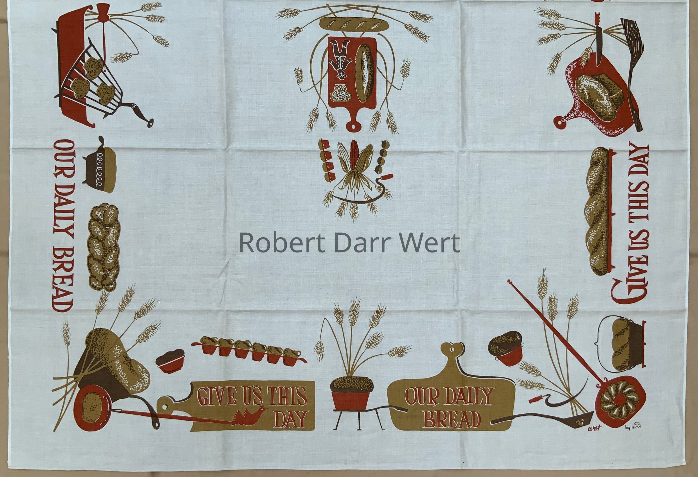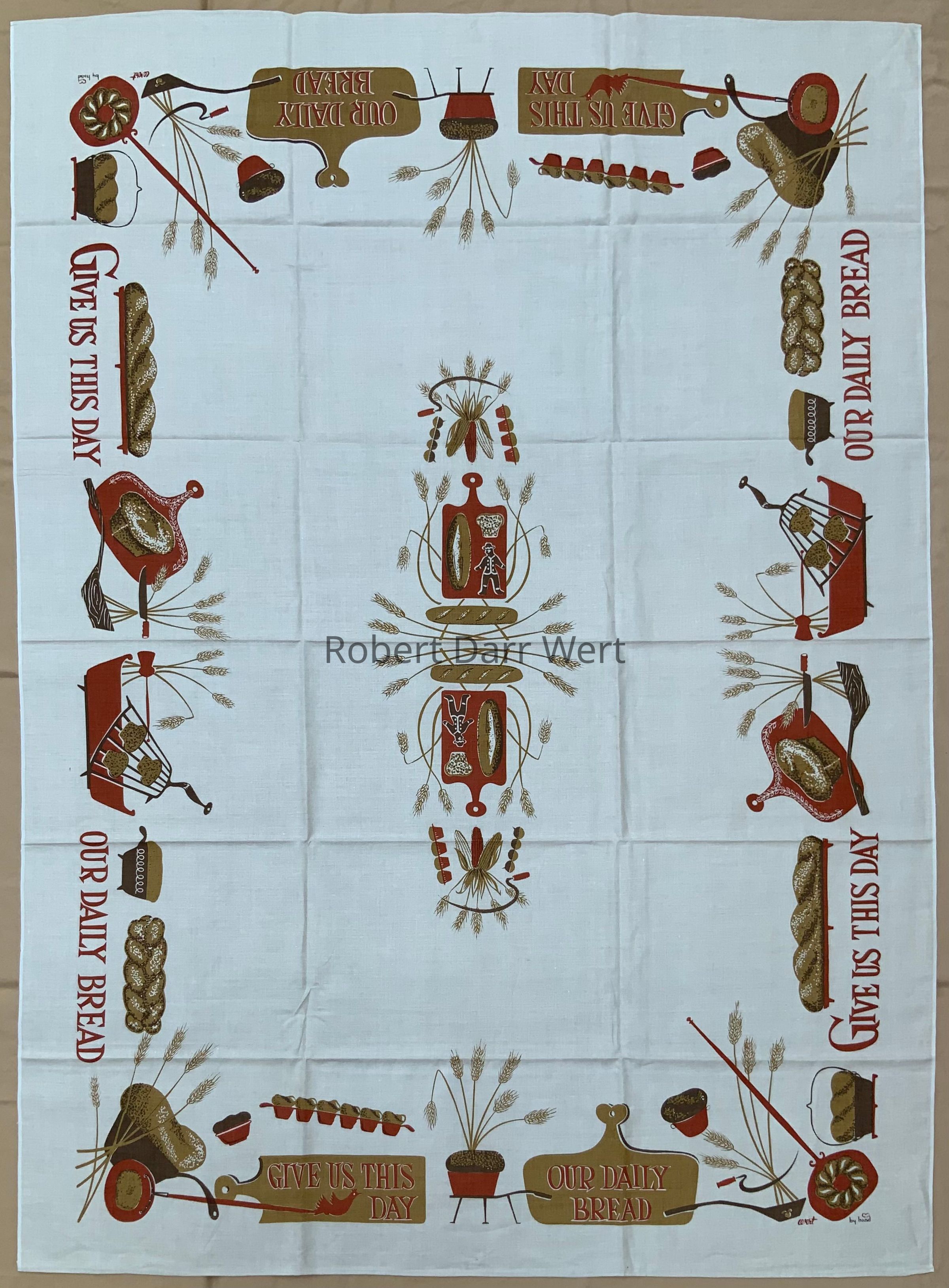 A tablecloth with a three-color silkscreen print on natural linen depicting numerous types of bread and baking implements supporting the phrase from the Lord’s Prayer, “Give us this day our daily bread”.