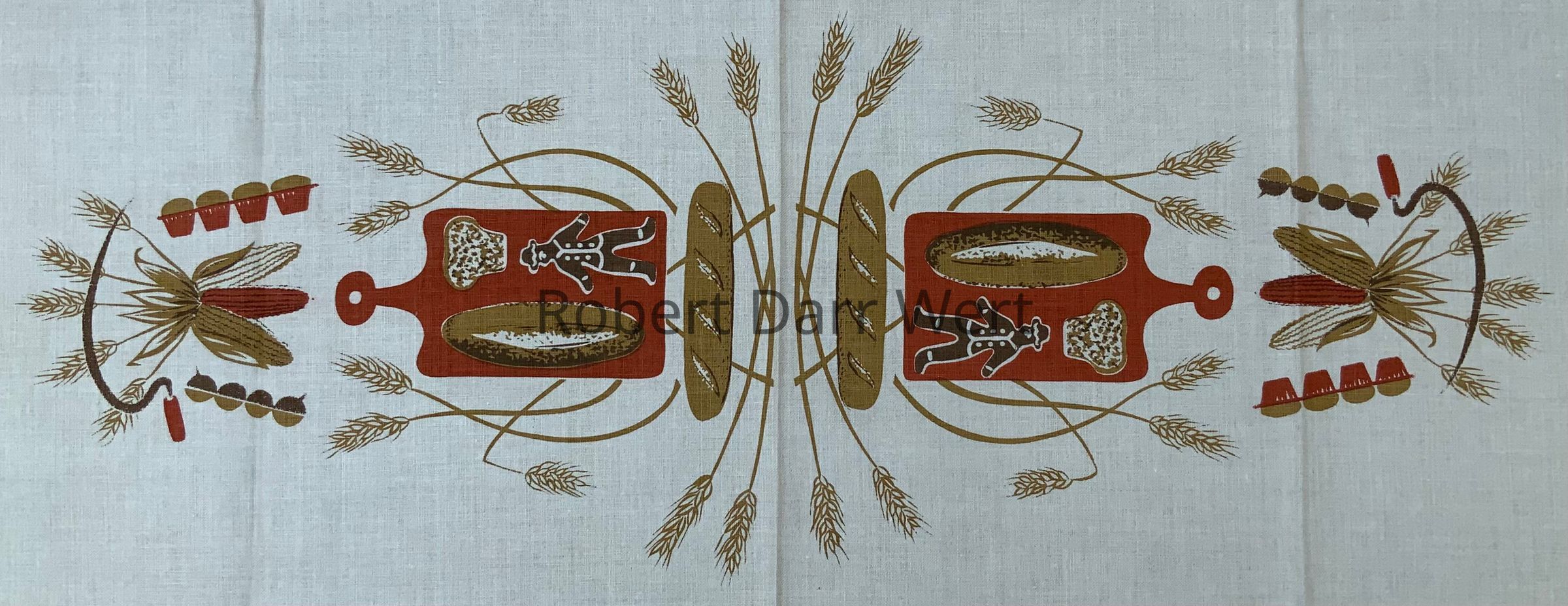 This tablecloth is listed in the January 1960 Country Prints price list in two sizes (52” x 52”, 52” x 72”), and two colorways (brick red or blue). It appears in the brochure “Mat Sets by Robert Darr Wert/Country Prints”, c.1960.