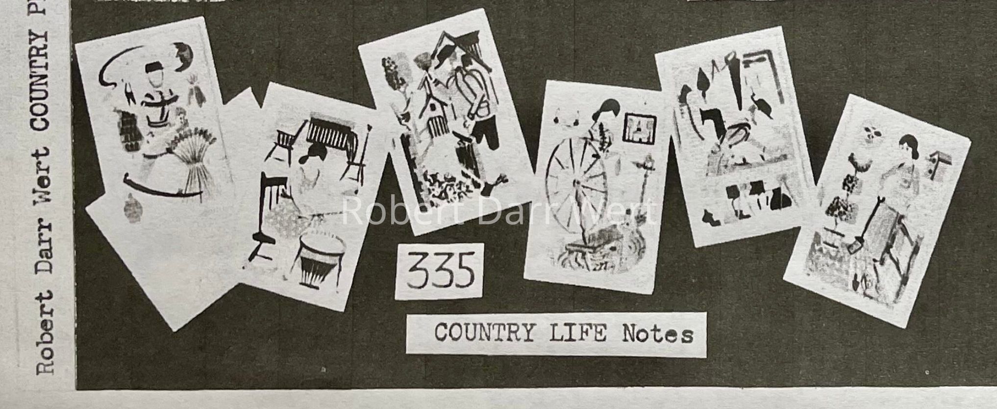 This set is Country Life Notes 335, a subset of Country Print Notes. It is listed on the Spring 1958 and January 1960 Country Prints price lists. It also appears in the c.1960 brochure “Mat Sets by Robert Darr Wert/Country Prints”, and was available in a wood box with a silkscreened lid.