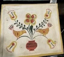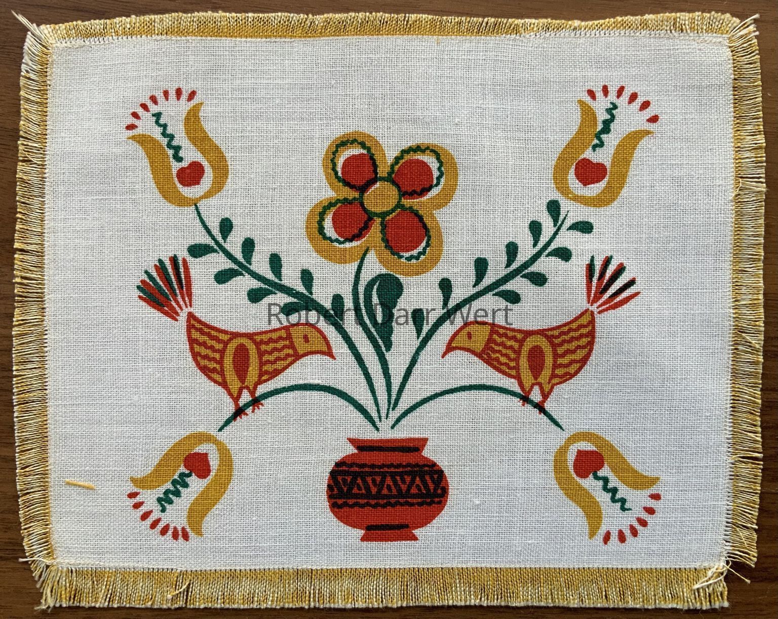 A pot holder with a three-color silkscreen print on off-white linen depicting Wert’s interpretation of Pennsylvania “Dutch” flowers and birds. The potholder has an attached silkscreen printed tag stating, “Country Prints, Northfield, Mass” in gray ink. This was produced within the first two years of Country Prints’ founding.