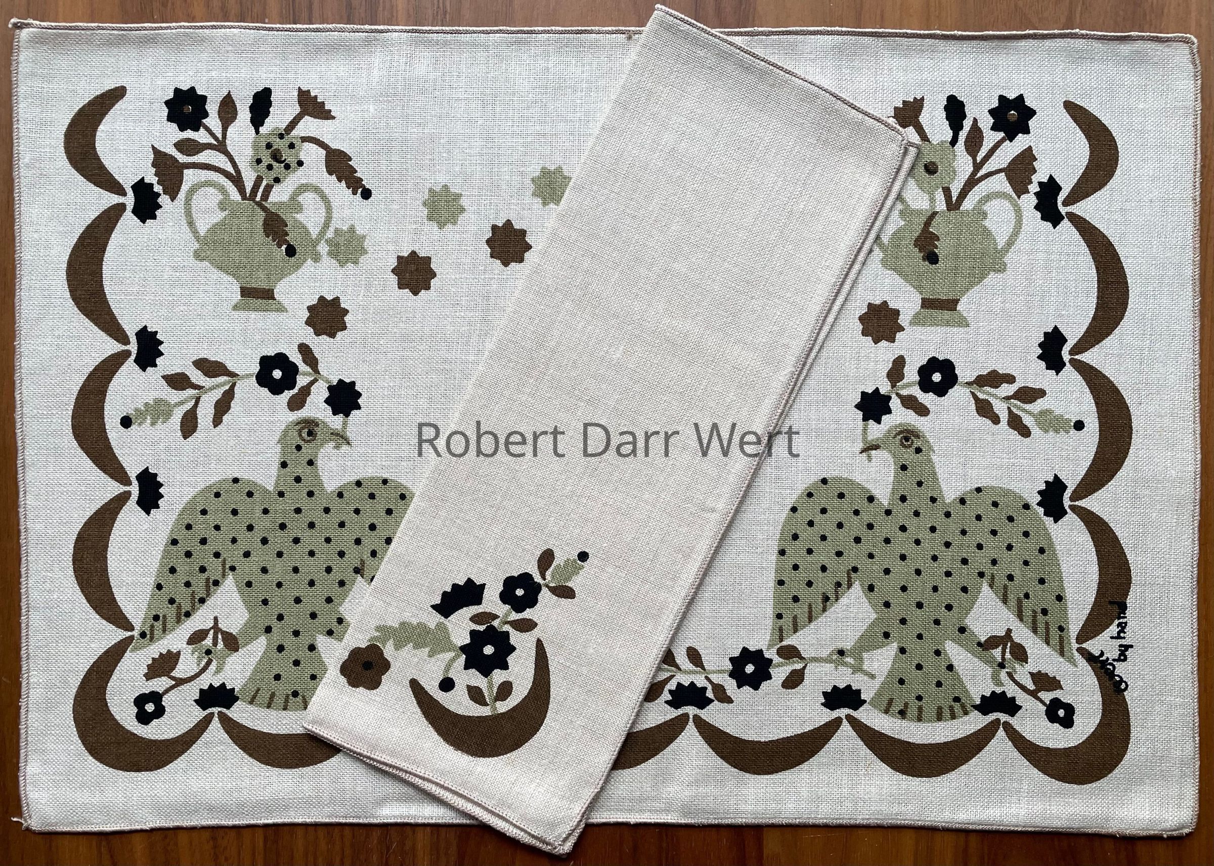 This design is listed on the January 1960 Country Prints price list in three colorways (brown, red, or blue), and appears in the c.1960 brochures “Mat Sets by Robert Darr Wert/Country Prints” with fringed edges, and “Country Prints by Robert Darr Wert and Neighbors”, c.1963, with serged and bound edges. See brochure images below.