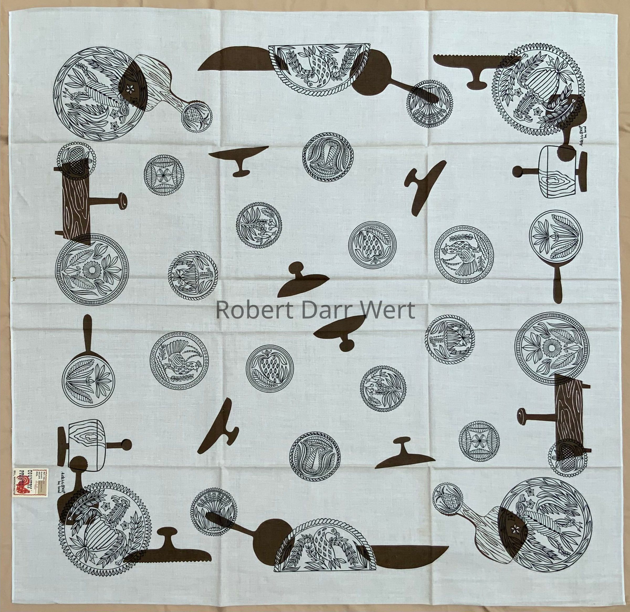 This tablecloth is listed in the January 1960 Country Prints price list in two sizes (52” x 52”, 52” x 72”), and two colorways (red or brown with black), and it appears in the c.1960 brochure “Mat Sets by Robert Darr Wert/Country Prints”, p.3; see images.Made/Created