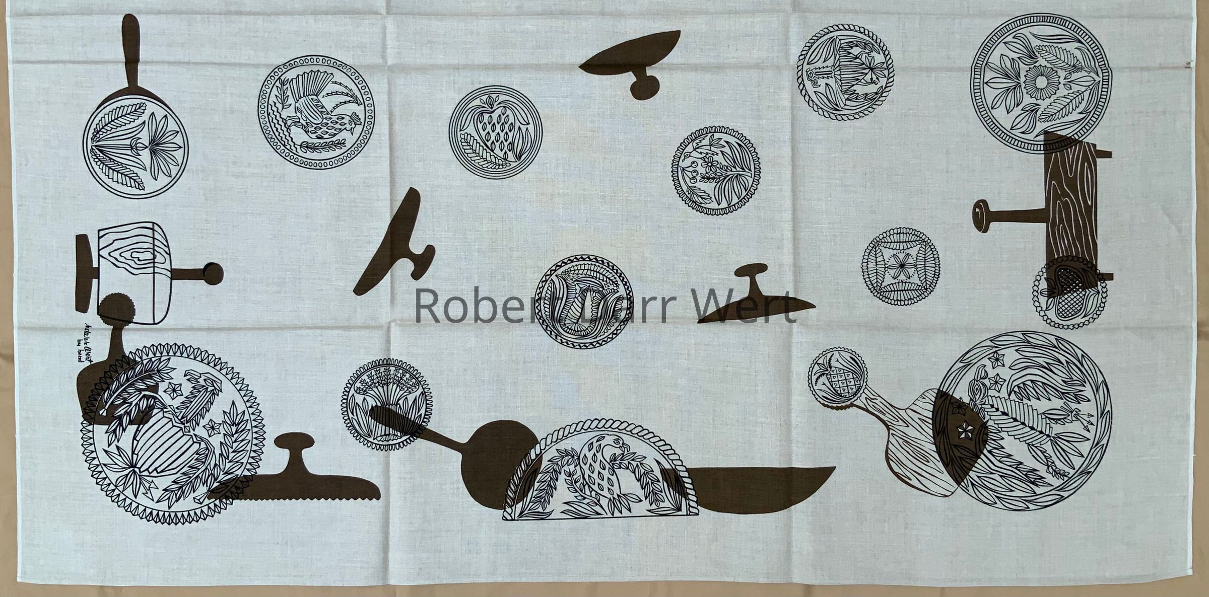 A two-color silkscreen print on natural linen depicting carved wood buttermolds and butter making tools. Symbols of freedom and abundance are illustrated in the carved imagery, including eagles, chickens, fruit and flowers.