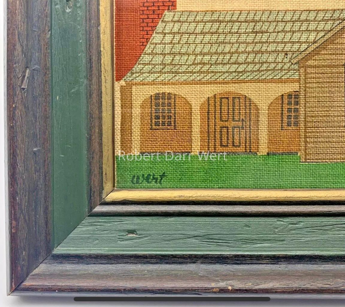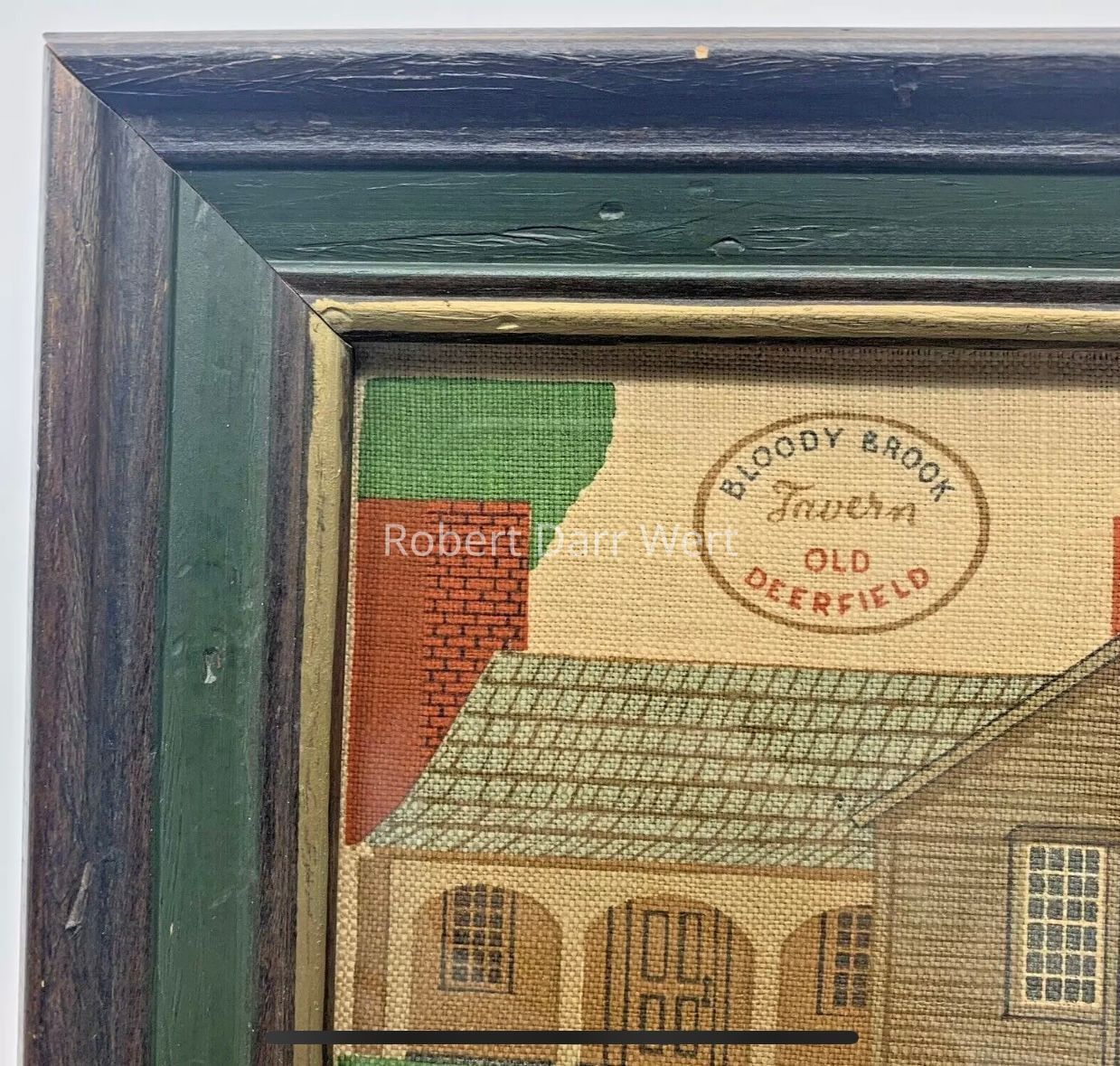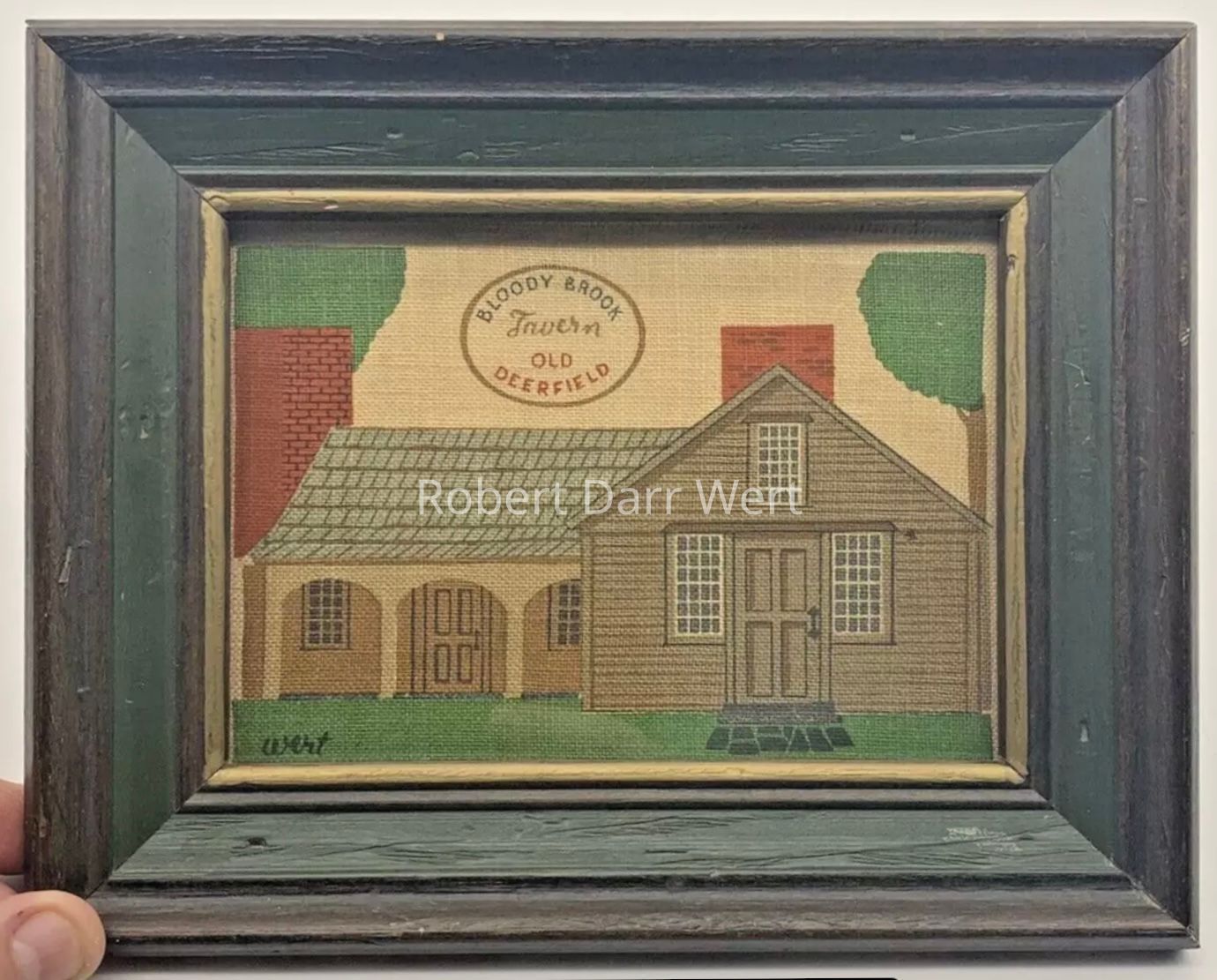 A silkscreen print on linen dry-mounted on chipboard depicting the Bloody Brook Tavern located at Old Deerfield Village, Massachusetts, now known as Historic Deerfield. The tavern is presented in elevation view, with partial perspective on the roofline at left. Typical muted Colonial era colors are utilized.