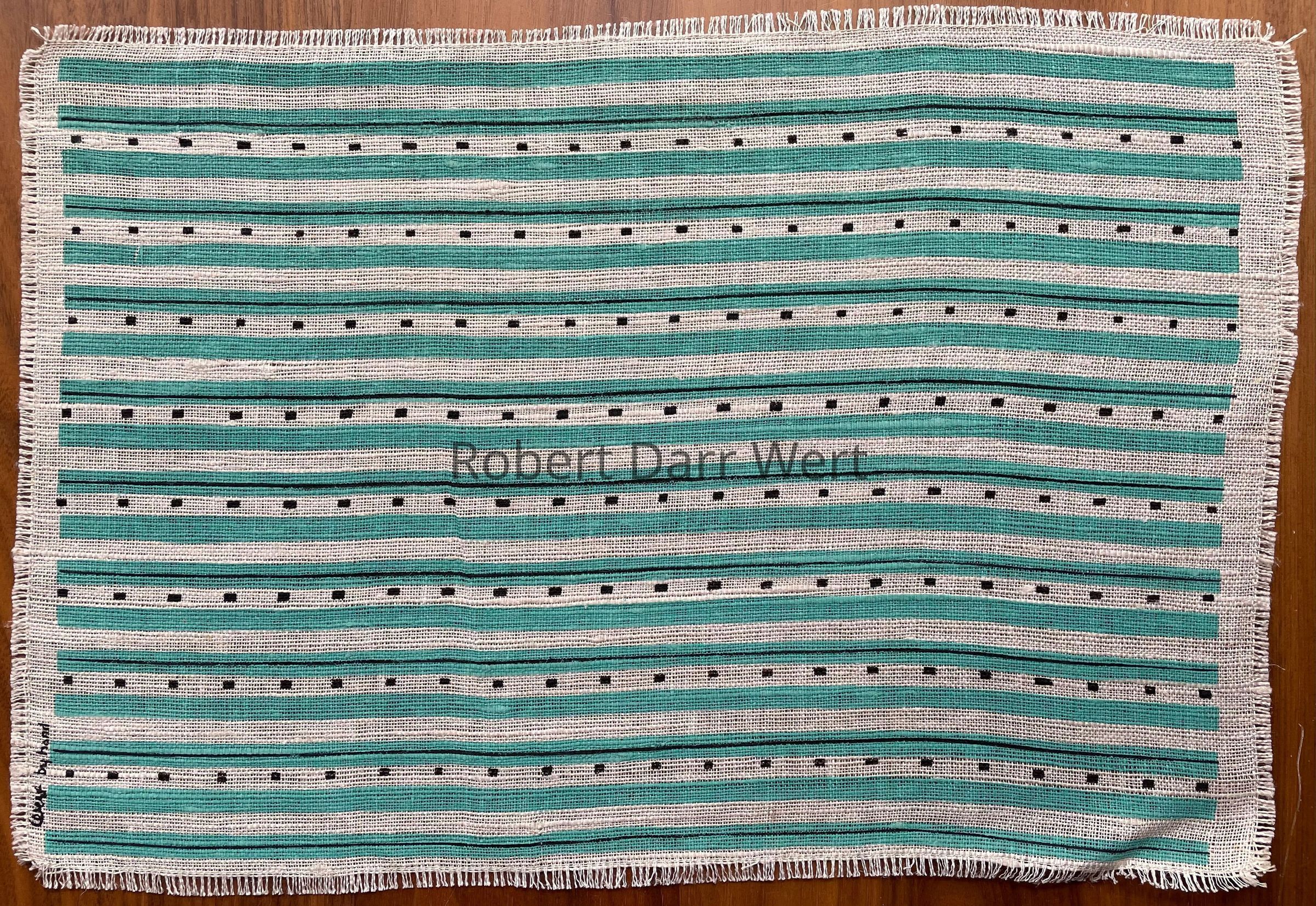 Placemat: a two-color silkscreen print on heaven texture off-white linen. The pattern is comprised of rows of solid color overprinted with thin black stripes and rows of small black rectangles.
