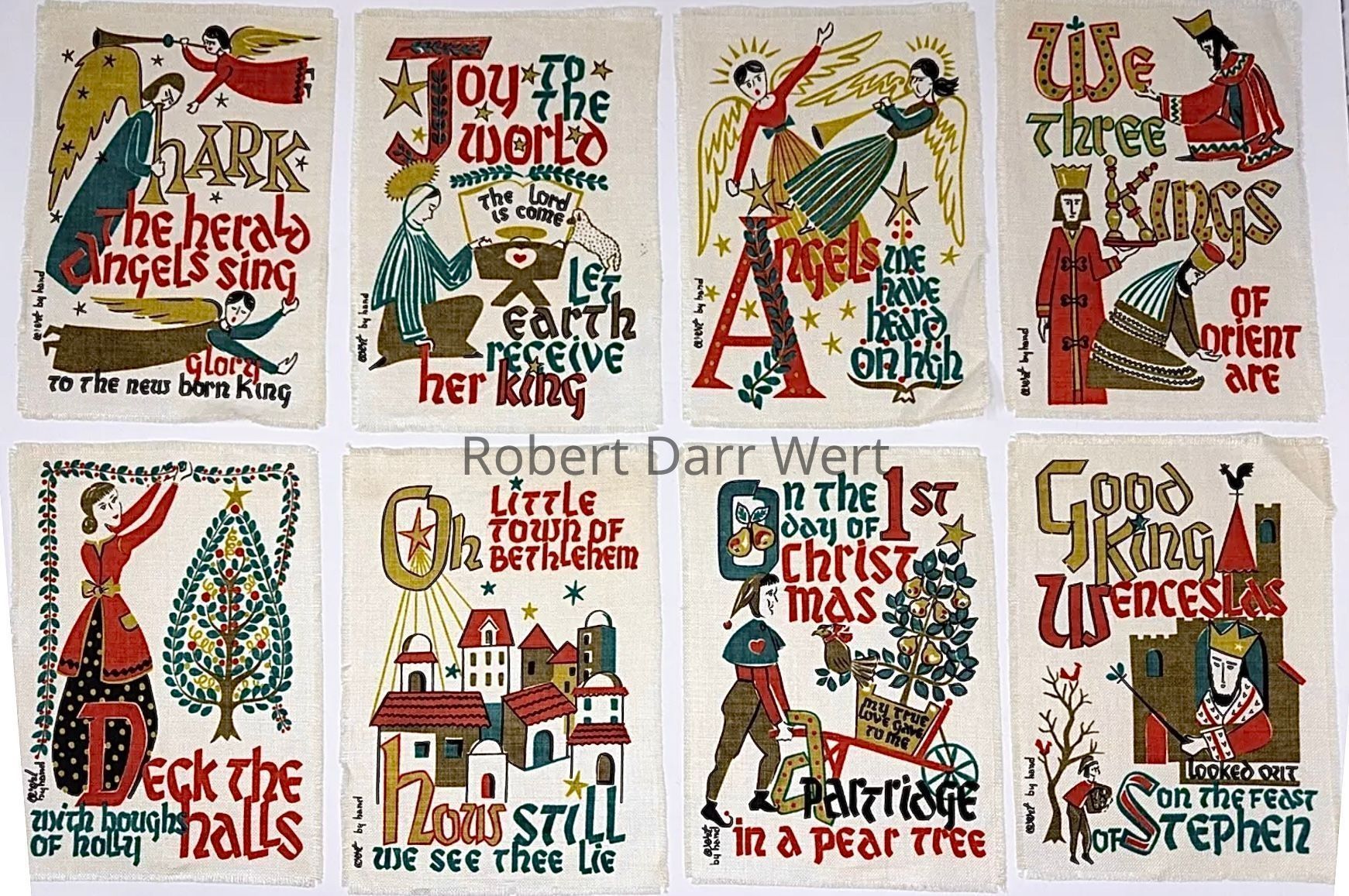 A complete set of eight Christmas Songs (TK) Gift Greetings, each print featuring the first line of and imagery related to each traditional carol. This set (or individual prints from within the set) may have been the Country Printers Christmas greeting in 1961 as indicated by Margaret Wert’s handwritten Christmas greeting list.