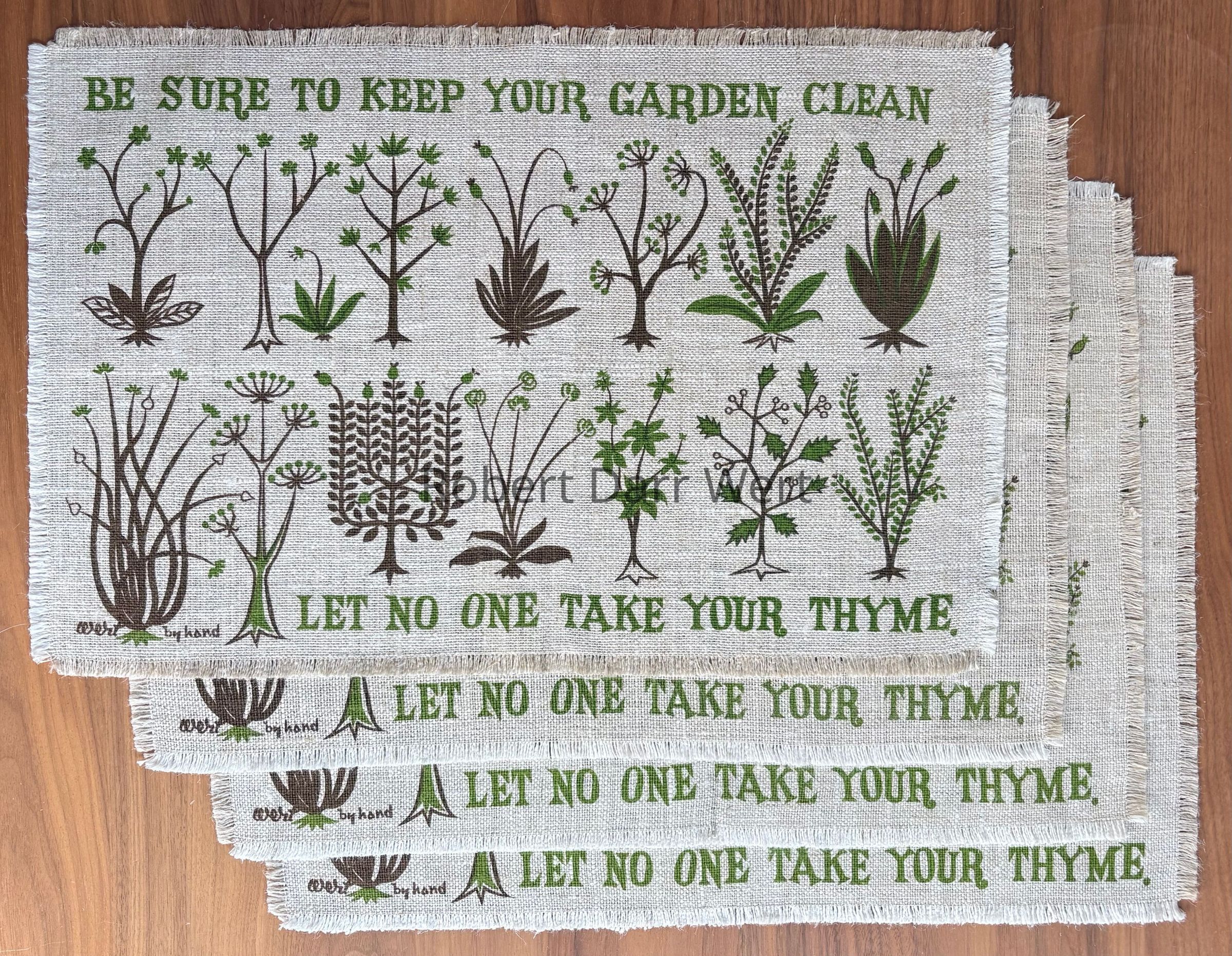 A two-color silkscreen print on heavy unbleached linen depicting conventionalized herb plants. The text is a partial lyric from a folk song with many titles that likens the cleanliness of a garden to a young woman’s romantic life. This oversized placemat is from a small line Country Prints produced called Barbecue Mats, which were meant for use on the picnic table. The somewhat rough linen fabric implies a more rugged use.