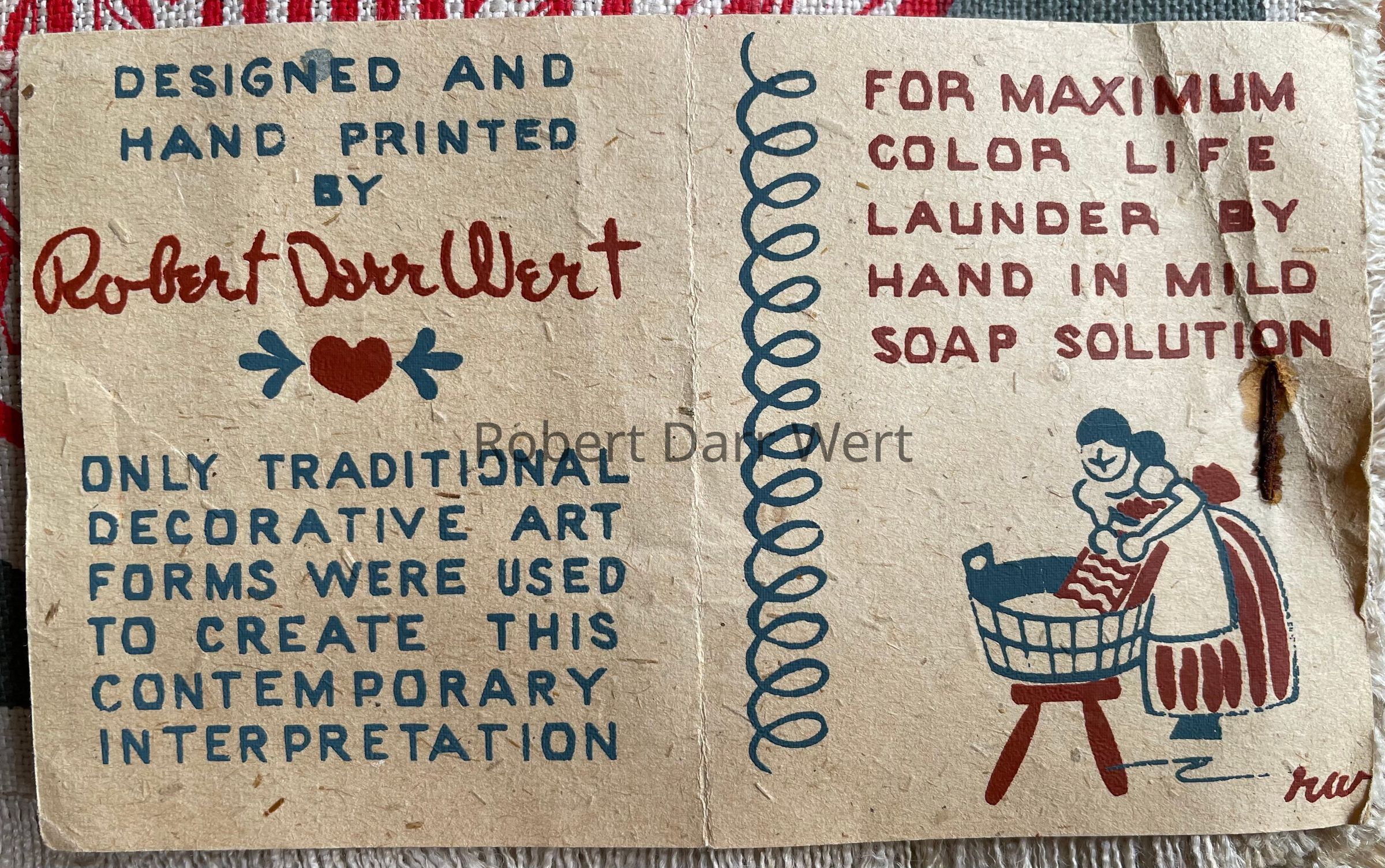 Tag interior states, “Designed and hand printed by Robert Darr Wert. Only traditional decorative art forms were used to create this contemporary interpretation”, and, “For maximum color life launder by hand in mild soap solution”.Made/Created