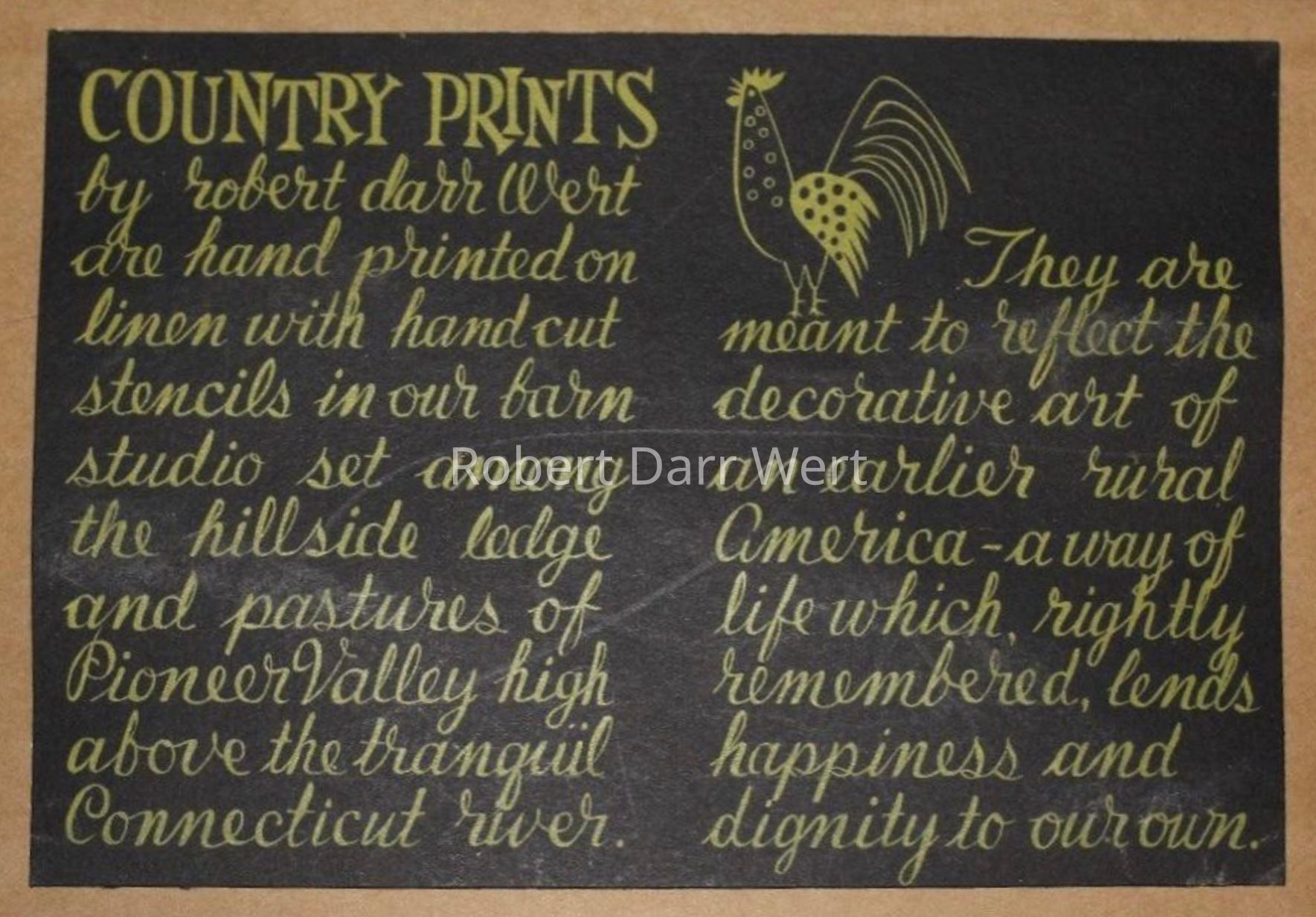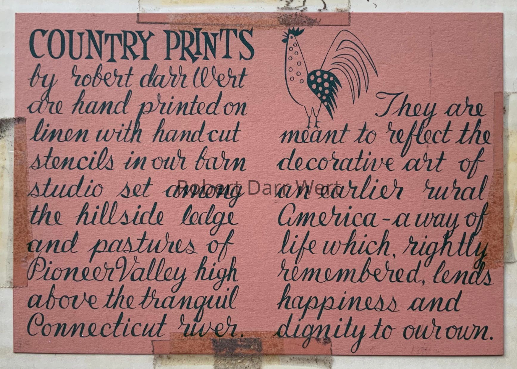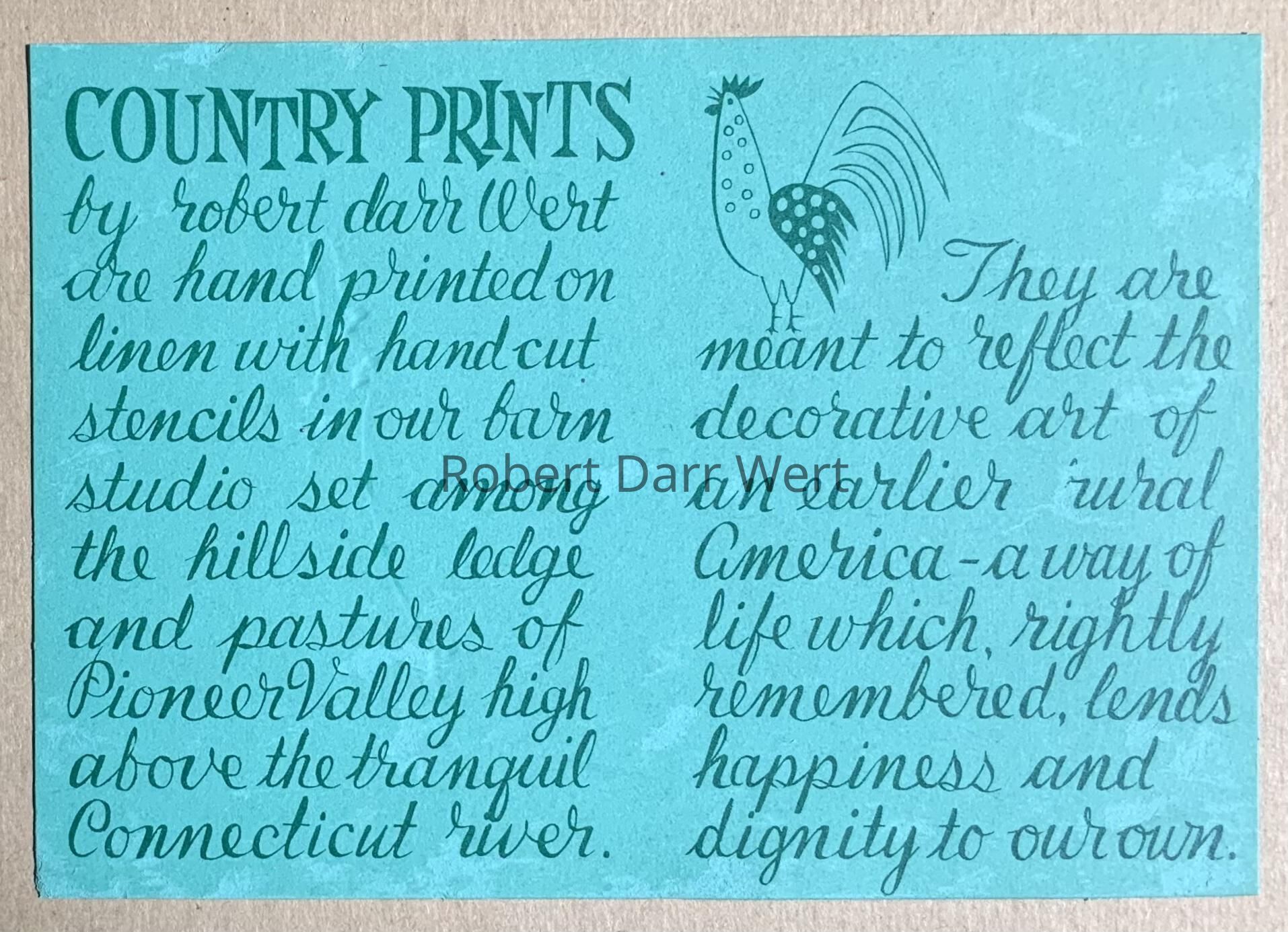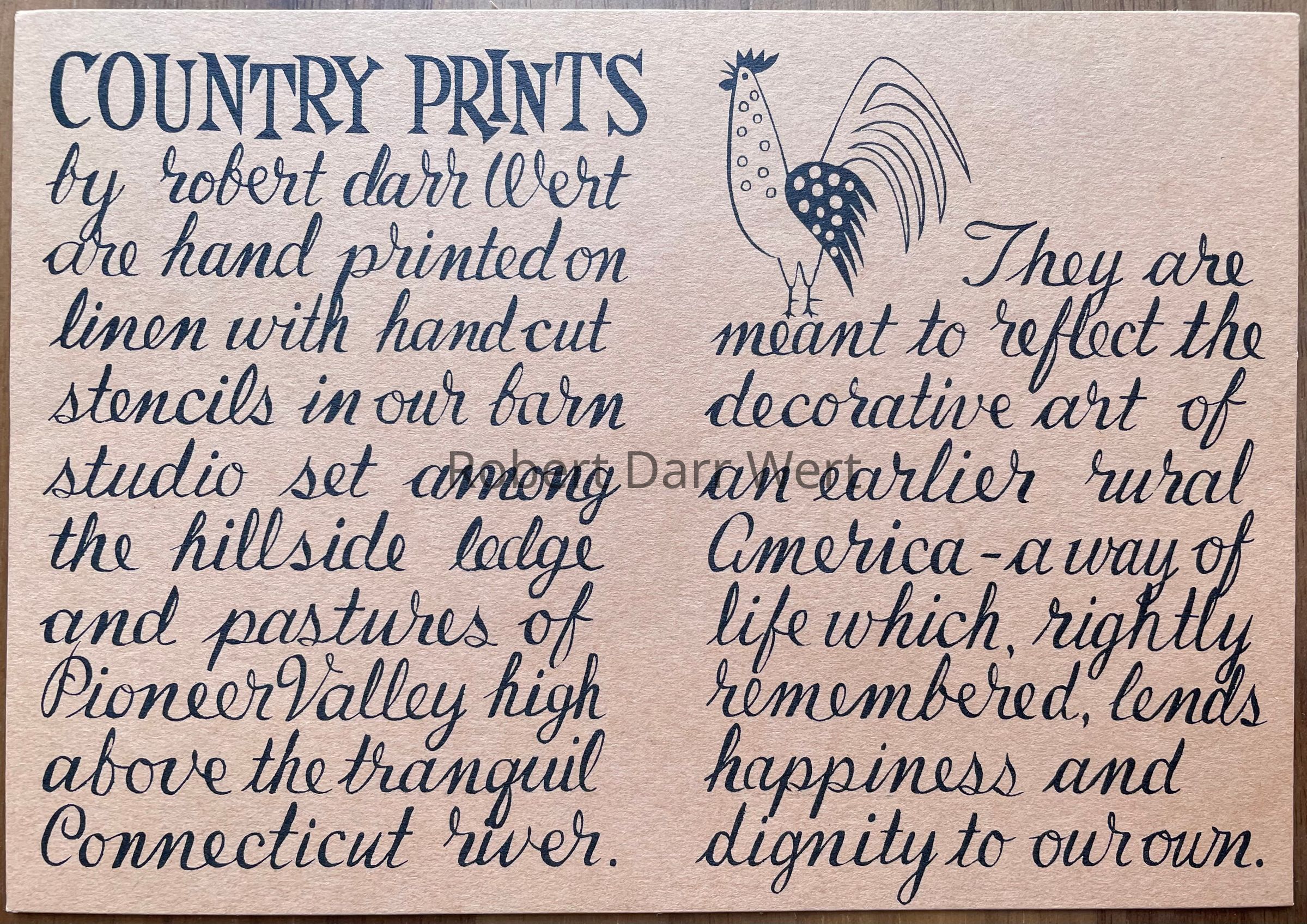 A c.1960 Country Prints story card used for brand identity on the back of framed prints, and inclusion with unframed products, etc. Card has been documented in four colors; see images.Made/Created
