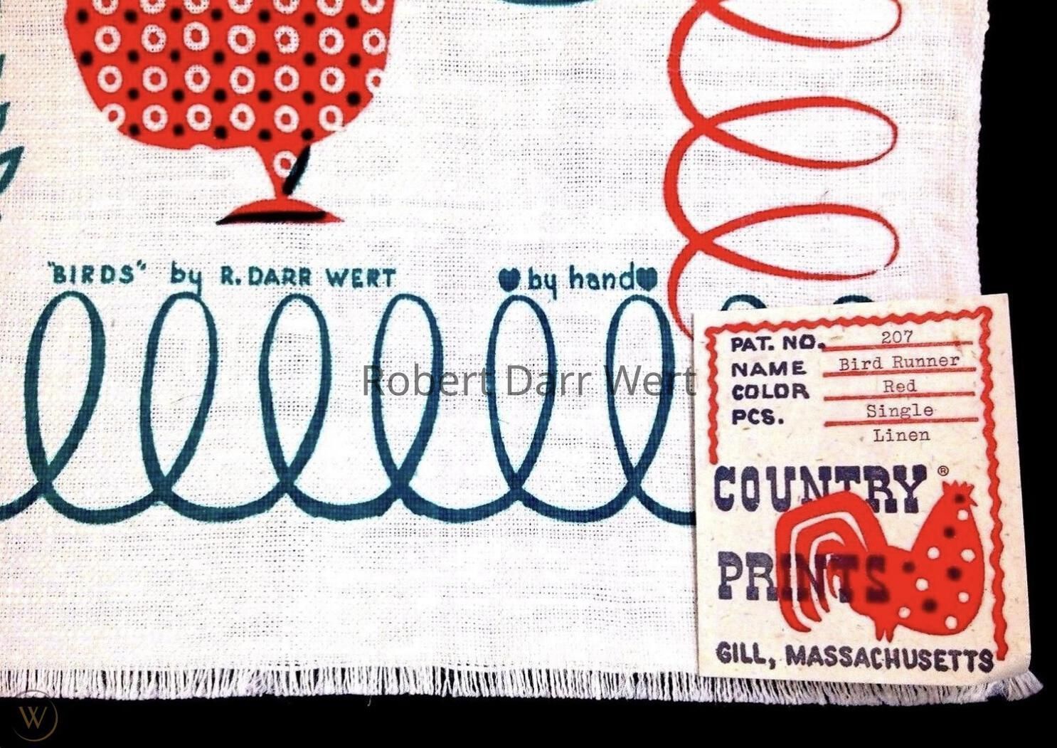 This print was marketed for use as a kitchen towel, wallhanging, or table runner, and is listed on a c.1951 Country Prints packing slip, and appears in a c.1952 brochure for Churchill Barn, owned by Stanley G. Churchill, Country Prints’ lead sales representative throughout the 1950’s. It is also illustrated in a 1953 ad for Coulter’s Department Store of Los Angeles, and is shown being printed in a 1959 article about Country Prints in the Springfield Republican of Springfield, Massachusetts; see images.
