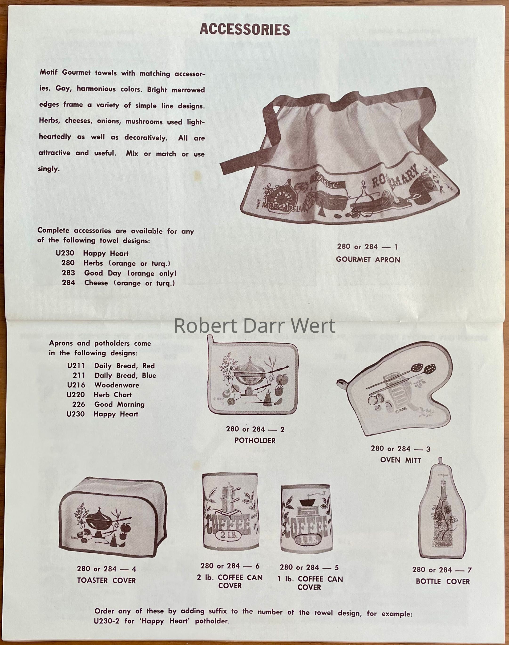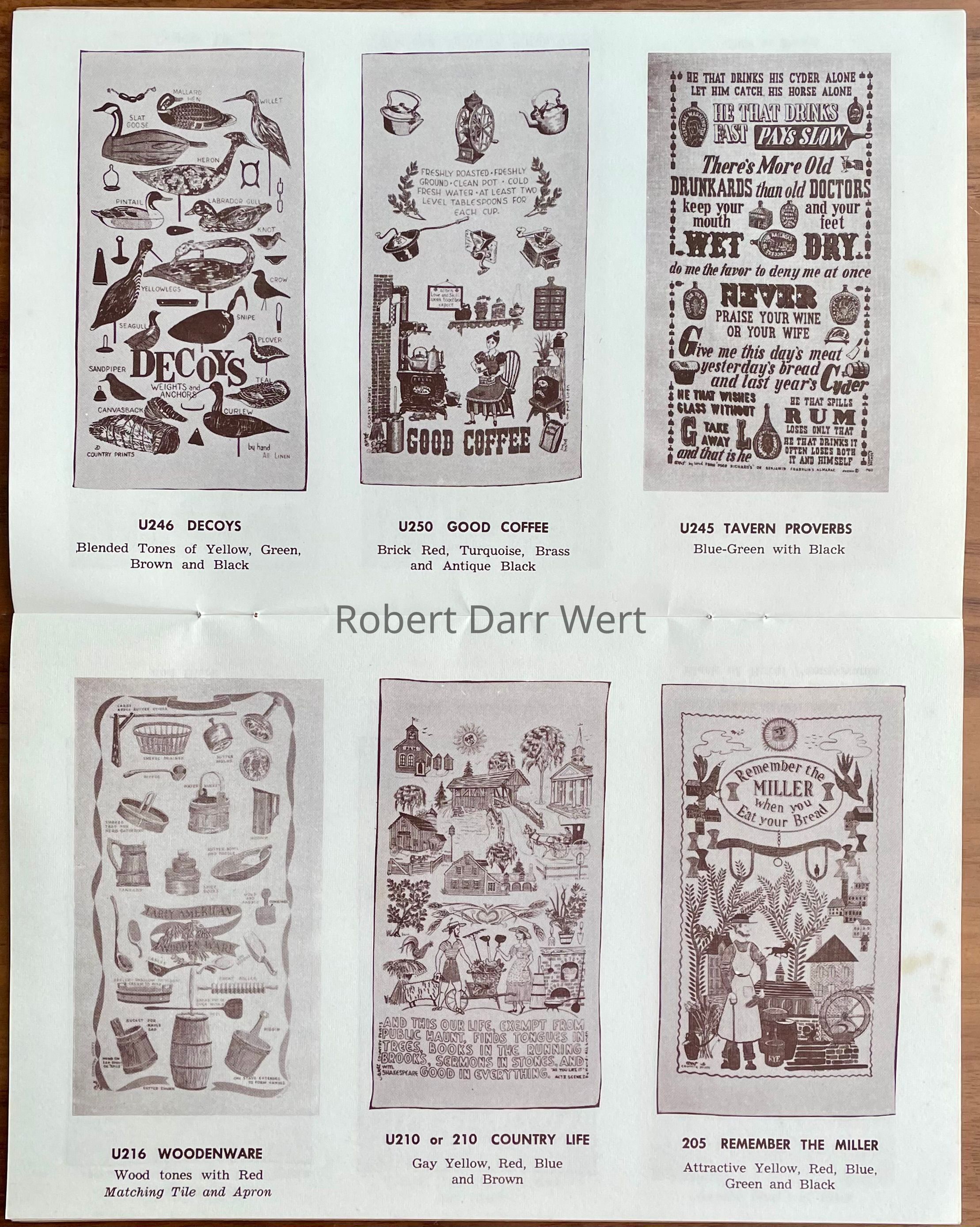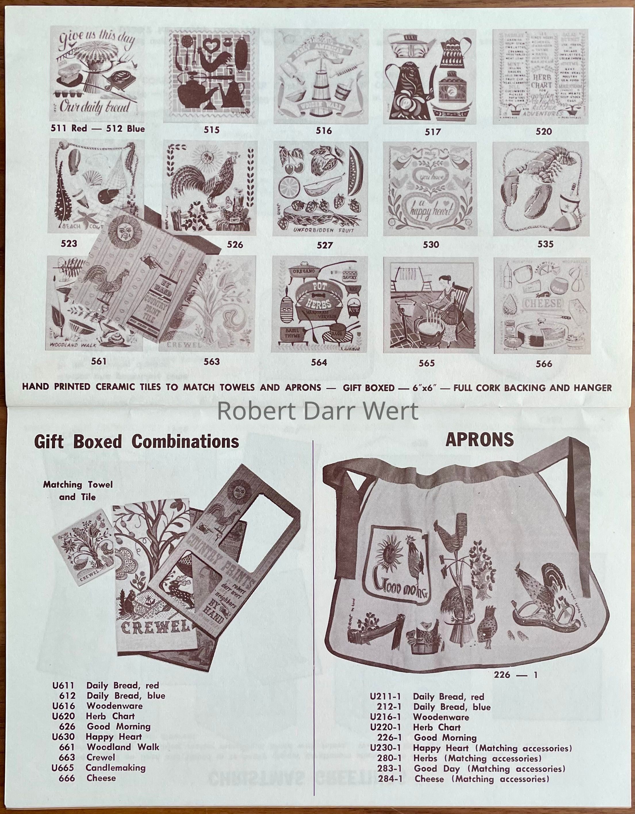 A c.1967 Country Prints wholesale brochure featuring the company story, thirty-nine towels/wallhangings, tiles, aprons, kitchen accessories, twelve Christmas cards, and nine Christmas wall hangings. Multiple gift sets of matching towels/wallhangings, tiles and aprons were available.