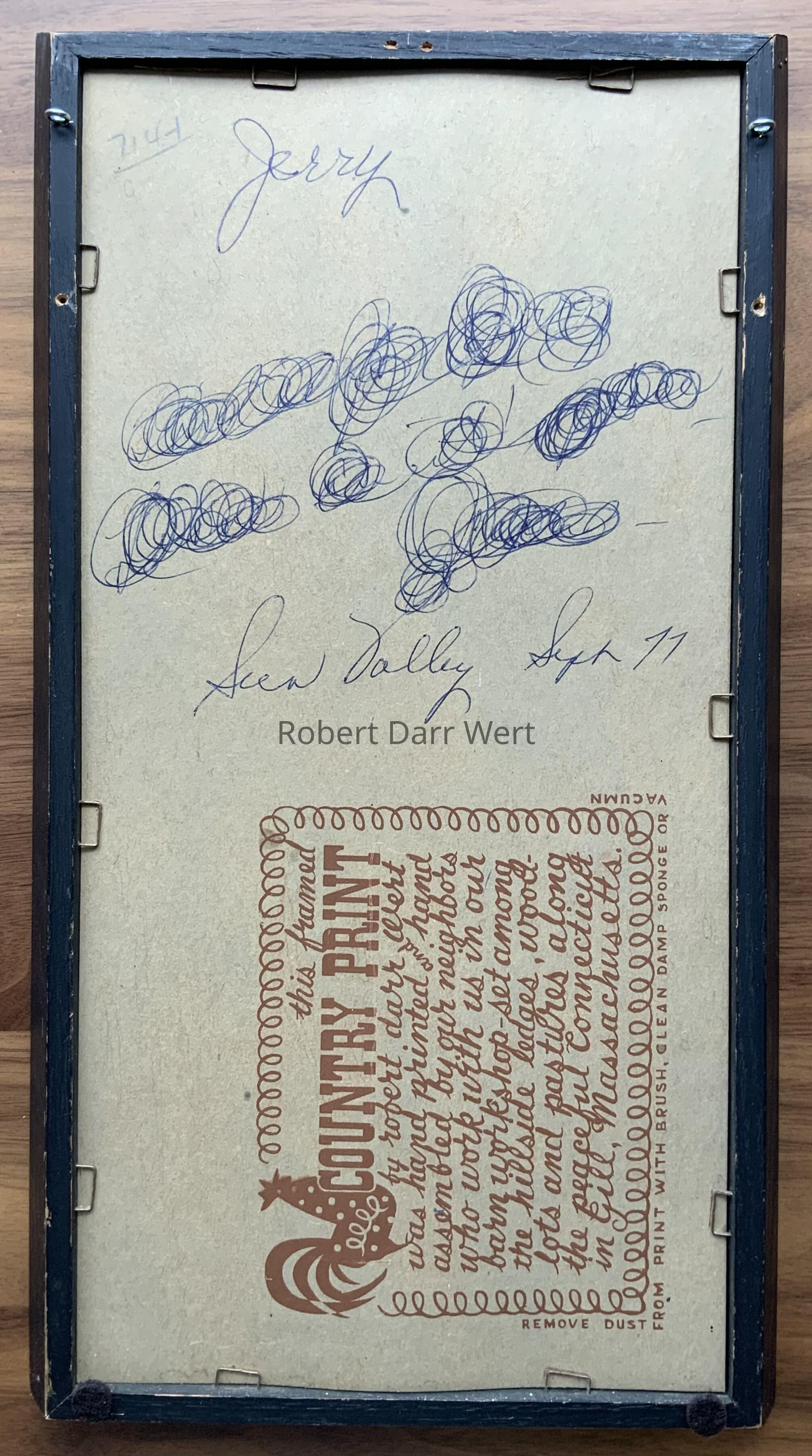 These 7”x14” prints appear singly in the c.1955 brochure “Country Prints in Frames” and the Spring 1958 Country Prints price list as Cherry Tree 714-1 and Patience Tree 714-2. They are listed in the January 1960 Country Prints price list in a choice of antique birch or flat black frames, and appear as a pair in the c.1960 brochure, “Country Prints in Frames Designed by Robert Darr Wert”, as Cherry Tree/Patience Tree 916-7, indicating the prints were reworked into a larger 9”x16” format (see separate entry for larger prints).Made/Created